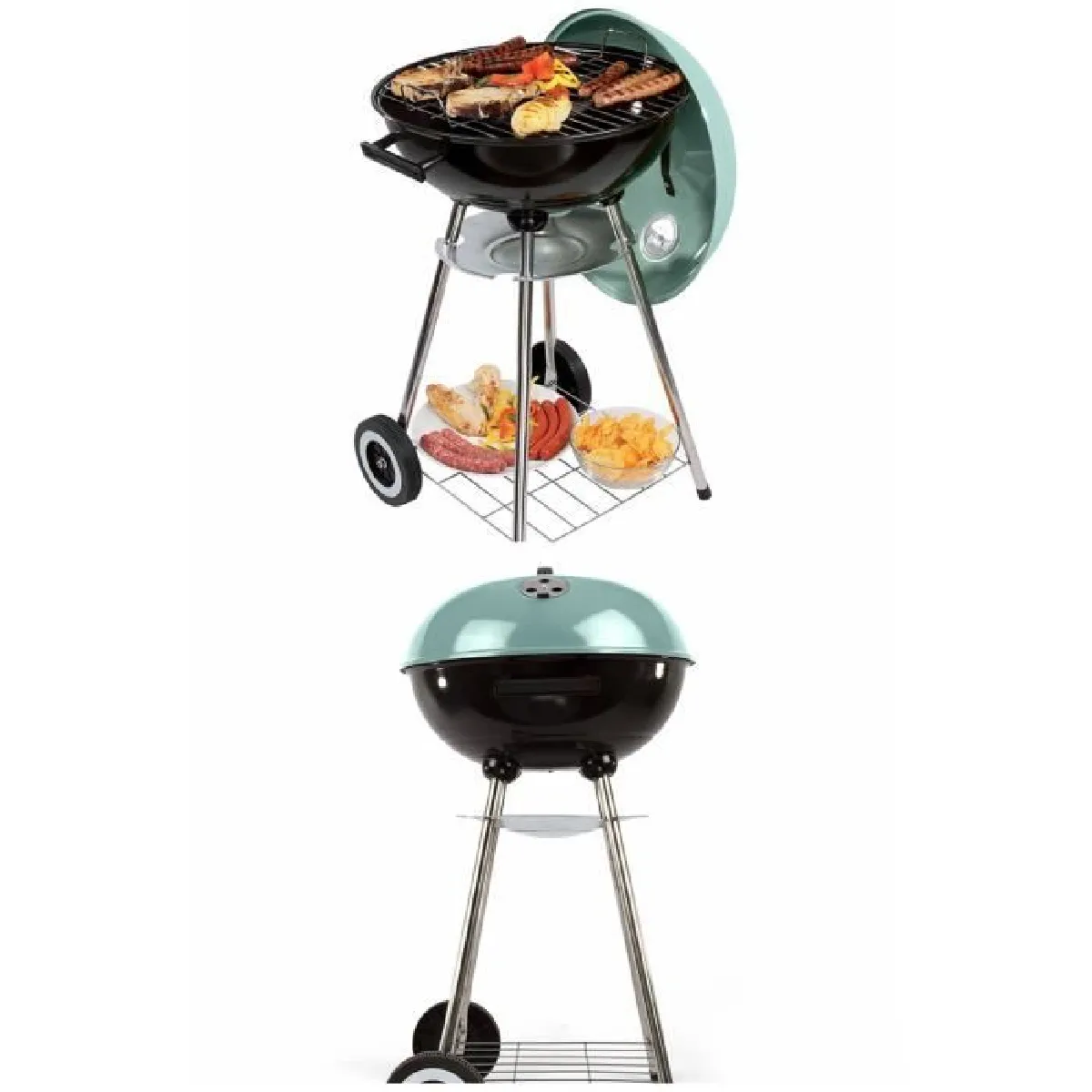 Barbecue à charbon Surface de cuisson Ø 41 cm Grille de cuisson chromée Revêtement en acier émaillé Grille d’aération et bac récupérateur de cendres en aluminium Poignées de transport latérales Piètement avec 2 roues Grille repose-plat.