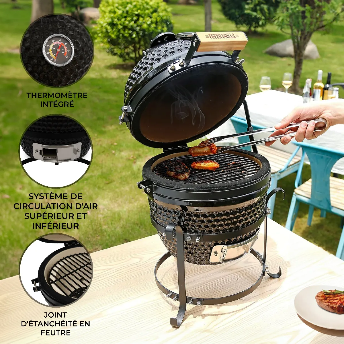 Barbecue charbon céramique - Thermomètre intégré - Ventilation double - Portatif