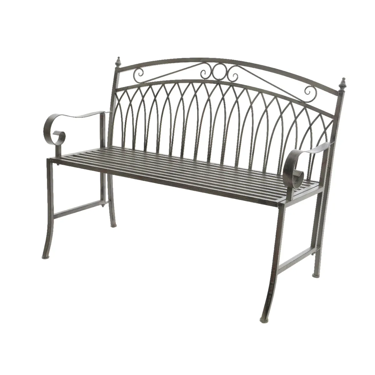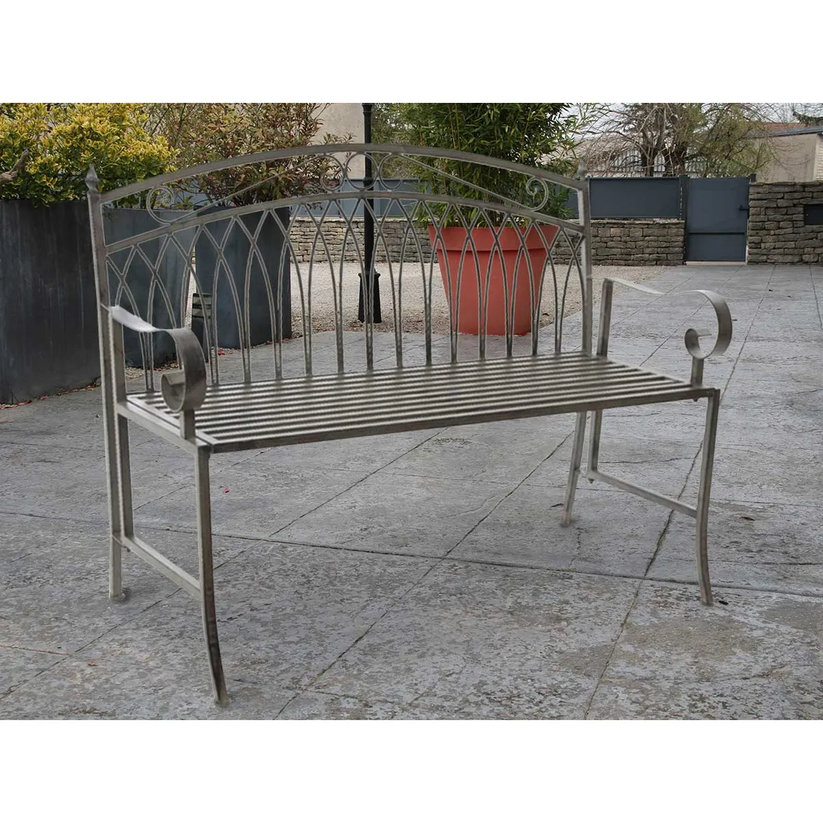 Banc de jardin en métal. Coloris : Gris. Dimensions : 118 x 45 x 88 cm.