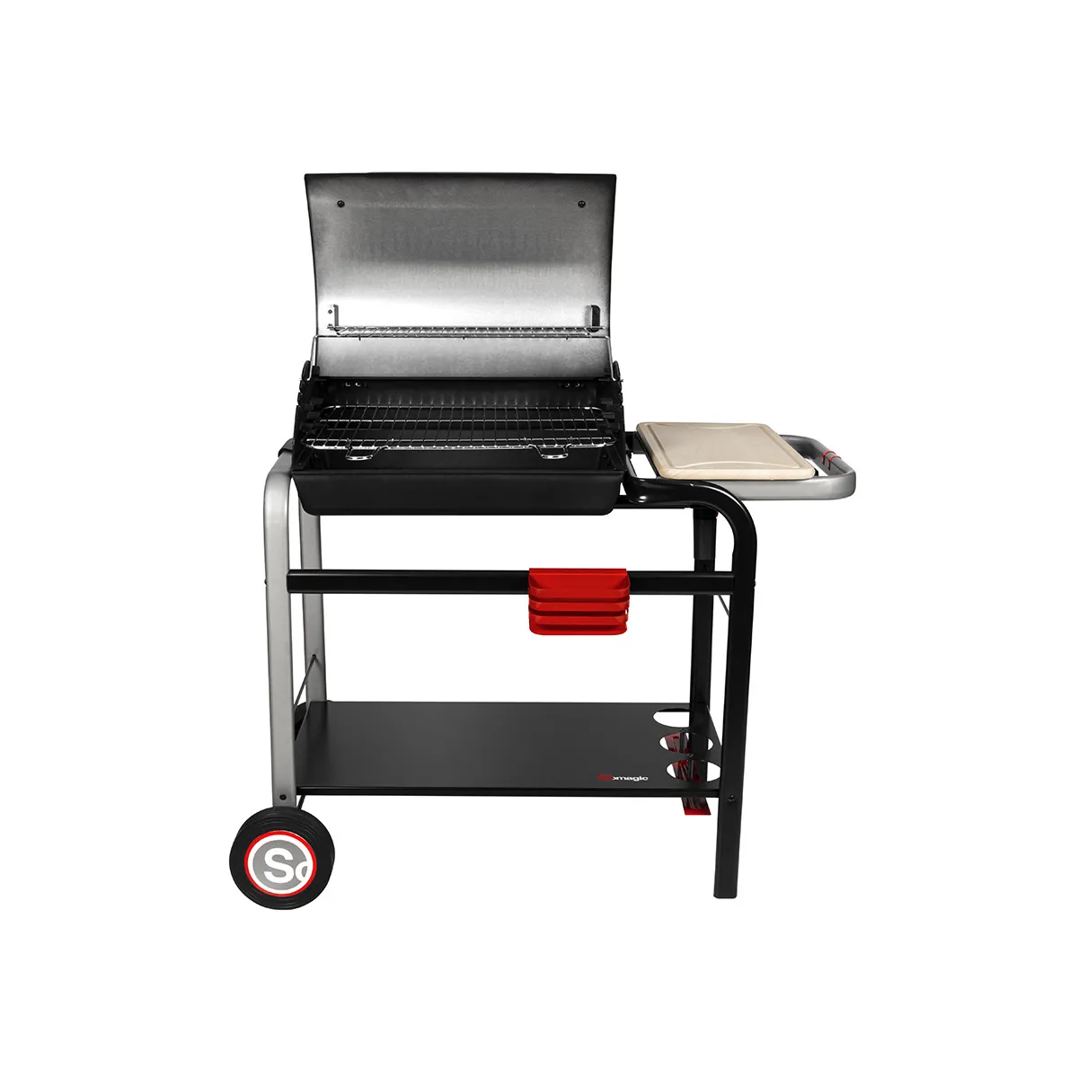 Barbecue à charbon Somagic Vulcano 2600brbrLe barbecue à charbon Somagic Vulcano 2600 offre l'essentiel pour griller. Il est tout équipé avec sa cuve en fonte, sa grille réglable en hauteur, sa grille de maintien au chaud, et son chariot.brbrLe chariot dispose d'un panier porte-bouteilles, un panier porte-épice, d'une plateforme de rangement et d'une planche à découper amovible.brbrÉquipé du système d'allumage Turbomagic, le barbecue à charbon Vulcano 2600 vous assure un feu sans effort en 12 minutes.brbrToutes les caractéristiques du barbecue à charbon Somagic Vulcano 2600brulliDimensions hors-tout (L x l x H) : 102 x 56,5 x 88,5 cm/liliHauteur grille/sol : 74 cm/liliDimension de la cuve : 61 x 41,5 cm/liliMatériau de la cuve : fonte/liliGrille de cuisson en acier chromé de 51,4 x 37 cm/liliGrille de maintien au chaud/liliSystème de soufflerie intégrée TURBOMAGIC/li/ulbrbrbrCaractéristiques techniquesbrbrulliCollection : Vulcano/liliConvient pour : 8 à 10 personnes/liliCouleur : Noir/liliCrochet(s) porte-accessoires : Oui/liliCuve : Fonte/liliDimensions (L x l x H) : 102 x 56,5 x 88,5 cm/liliFoyer vertical : Non/liliGarantie : 2 ans/liliGrille : Acier chromé/liliGrille d'attente : Oui/liliMarque : SOMAGIC/liliMatière(s) : Fonte/liliOrigine : Fabriqué en France/liliPoids : 30,80 kg/liliRécupérateur de cendres : Non/liliRéglage hauteur de grille : Oui/liliRoulettes de déplacement : Oui/liliSurface de cuisson : 51,4 x 37 cm/liliSystème d'allumage rapide : Oui/liliTablette(s) latérale(s) : Oui/li/ul