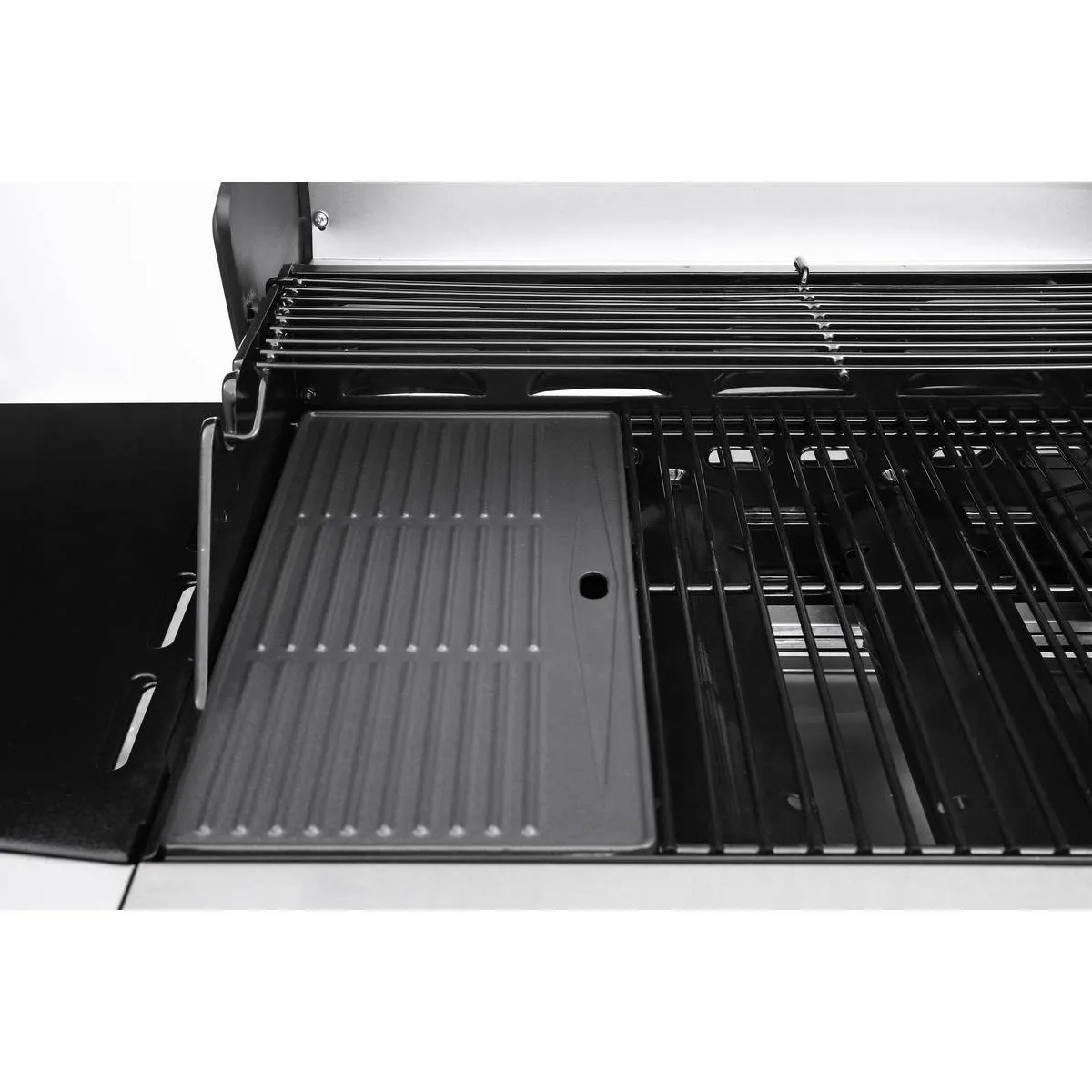 Commentaire vendeur : Barbecue Gaz - Éclairage LED blanche - 4 brûleurs dont 1 latéral - Eclairage LED sur les 3 boutons de contrôle - Acier - Surface de cuisson : 67 x 44 cm - Jauge de température intégrée - Espace de rangement - Housse protection inclus - Gaz butane - Détendeur et tuyau non inclus