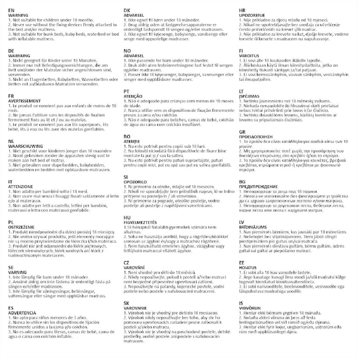 Le garde-corps n'est pas recommandé pour les enfants de moins de 18 moins ou de plus de 5 ans. Le garde-corps ne convient pas aux personnes âgées ou aux adultes infirmes, ni à une utilisation dans un environnement non domestique. Veuillez suivre les instructions du fabricant concernant la taille du lit et du matelas auxquels convient le garde-corps.