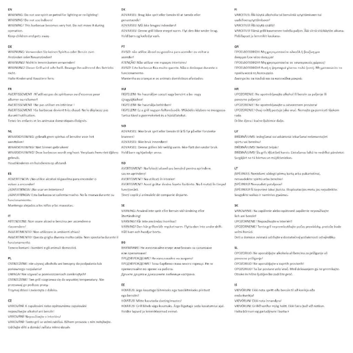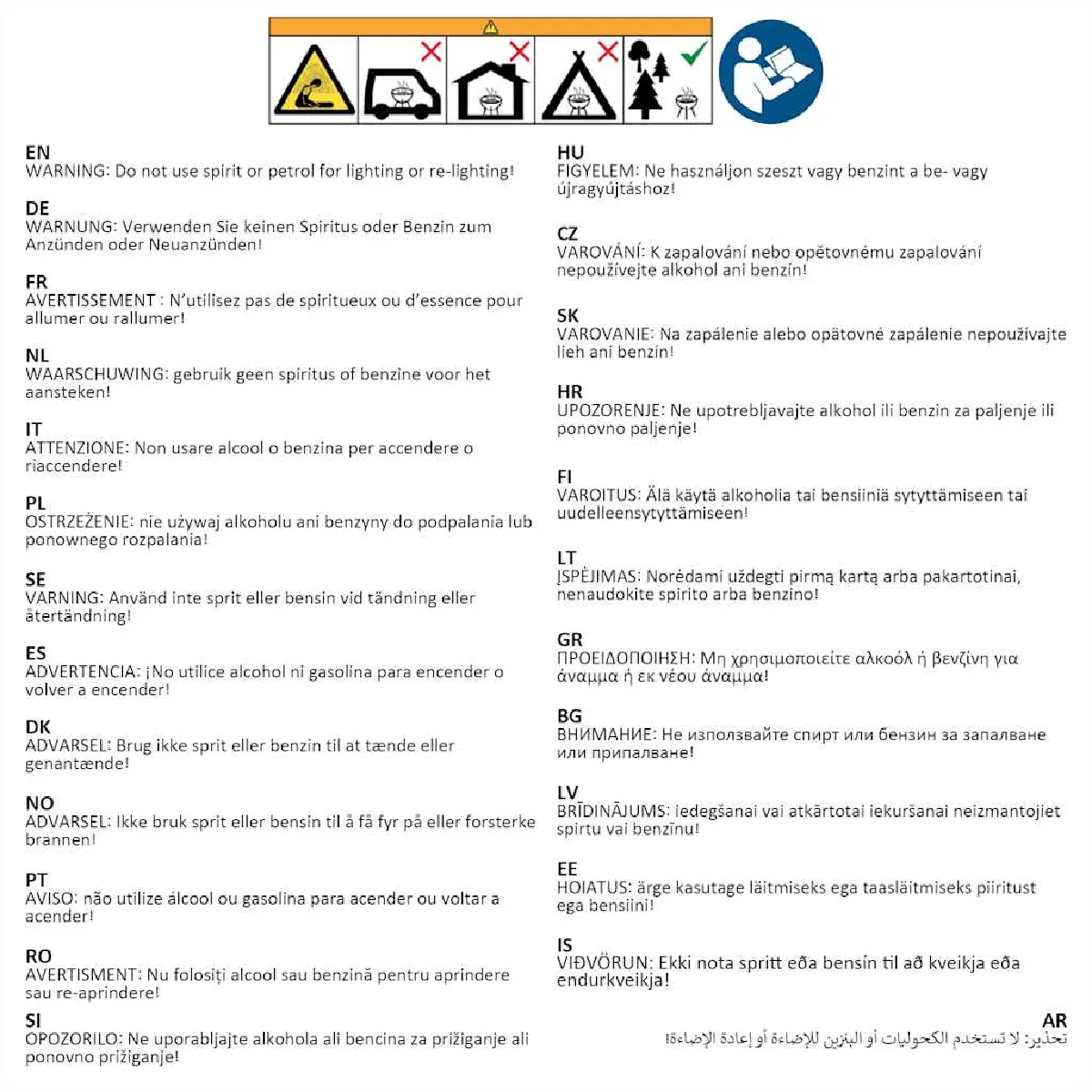 AVERTISSEMENT : Nutilisez pas de spiritueux ou dessence pour allumer ou rallumer! AVERTISSEMENT ! Ne pas utiliser en intérieur ! AVERTISSEMENT ! Ce barbecue devient très chaud. Ne le déplacez pas durant l'utilisation. Tenez les enfants et les animaux domestiques éloignés.