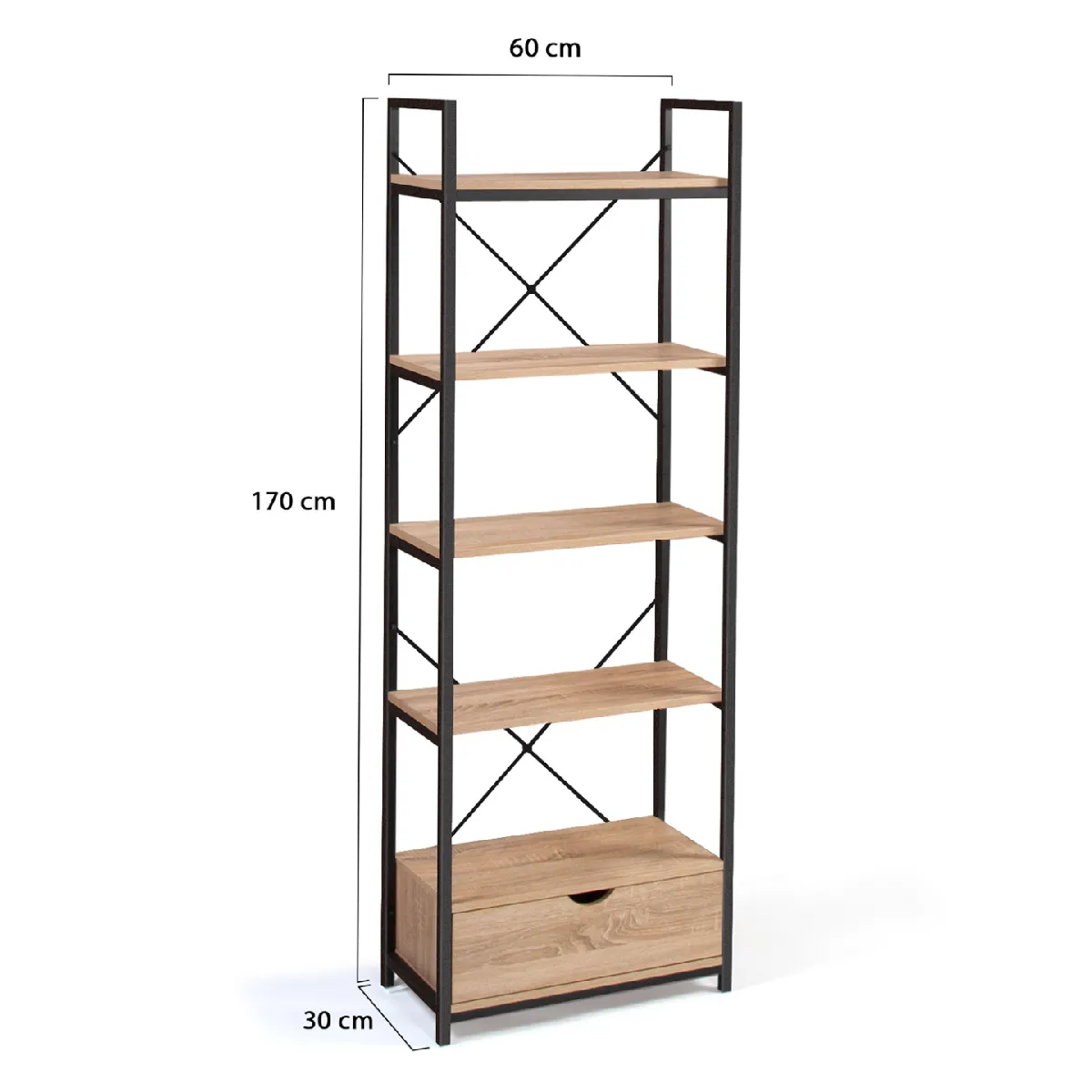 Descriptif de l'étagère 5 niveaux avec tiroir DETROIT design industrielDonnez une touche industrielle à votre intérieur grâce à notre étagère 5 niveaux avec tiroir design industriel DETROIT bois et métal noir.Son style moderne, contemporain et ses lignes sobres offriront à votre salon, bureau ou cuisine un esprit "factory" ! De quoi créer une ambiance ultra chaleureuse type loft, cosy et tendance ! Esthétique, cette jolie étagère bibliothèque trouvera idéalement sa place dans les intérieurs urbains et contemporains, mais aussi plus rustiques.Les 5 tablettes larges maxi capacité vous permettront de disposer élégamment vos livres, objets de décoration, et boîtes de rangement. Entreposez vos affaires sur plusieurs étages pour organiser votre rangement ! Son tiroir inférieur vous offre un espace de rangement fermé supplémentaire !La matière et la couleur des étagères en particules de bois (PB épaisseur 1,5 cm) lui confèrent une véritable authenticité.La structure du meuble, en métal noir (épaisseur des tubes 1,5 cm x 1,5 cm), lui assure solidité et robustesse. De jolis croisillons participent à l'esthétisme et à la stabilité de la structure.Conçue tout en hauteur, vous gagnerez de l'espace au sol dans votre pièce !Grâce à cette étagère fonctionnelle, vos objets de déco et petites plantes d'intérieur sont mis en valeur !Laissez vous séduire dès maintenant par notre étagère industrielle 5 niveaux avec tiroir à petit prix !Dimensions de l'étagère 5 niveaux DETROIT design industrielDimensions totales : Longueur 60 x largeur 30 x Hauteur 170 cmDimensions extérieures du tiroir : Longueur 55,5 cm x largeur 26,5 cm x Hauteur 16,5 cmDimensions intérieures du tiroir : Longueur 48 cm x largeur 23,5 cm x Hauteur 14 cmHauteur entre chaque étagère : 28 cmEpaisseur des planches : 1,5 cmRetrouvez l'ensemble de notre collection industrielle sur notre boutique en ligne !