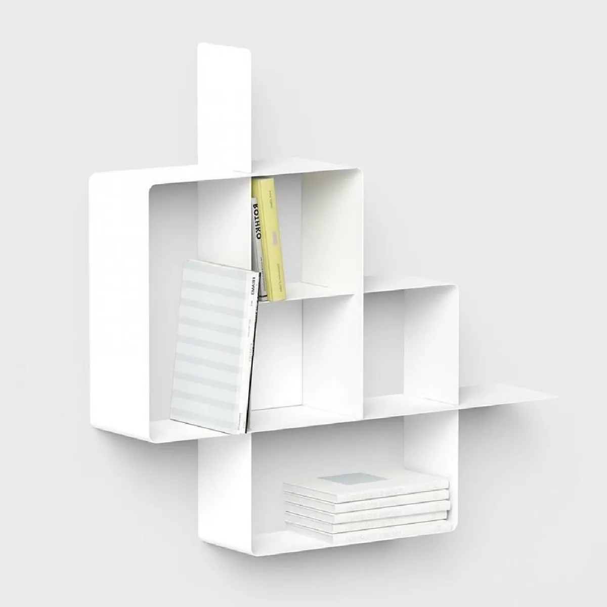 Le module offre une structure en feuille d'acier colorée sablée pensée pour créer des rangements ouverts et aérés. Sa conception à éléments imbriqués autorise un montage horizontal, vertical ou diagonal selon l'espace. En combinant plusieurs unités, il devient possible d'adapter la capacité et le rythme visuel à chaque pièce, avec une liberté de composition qui facilite l'optimisation des murs. Le coloris blanc s'intègre facilement, tandis que la profondeur mixte de 22 et 25 cm accueille livres et objets du quotidien. L'ensemble se pose au sol et peut être fixé au mur pour plus de stabilité.