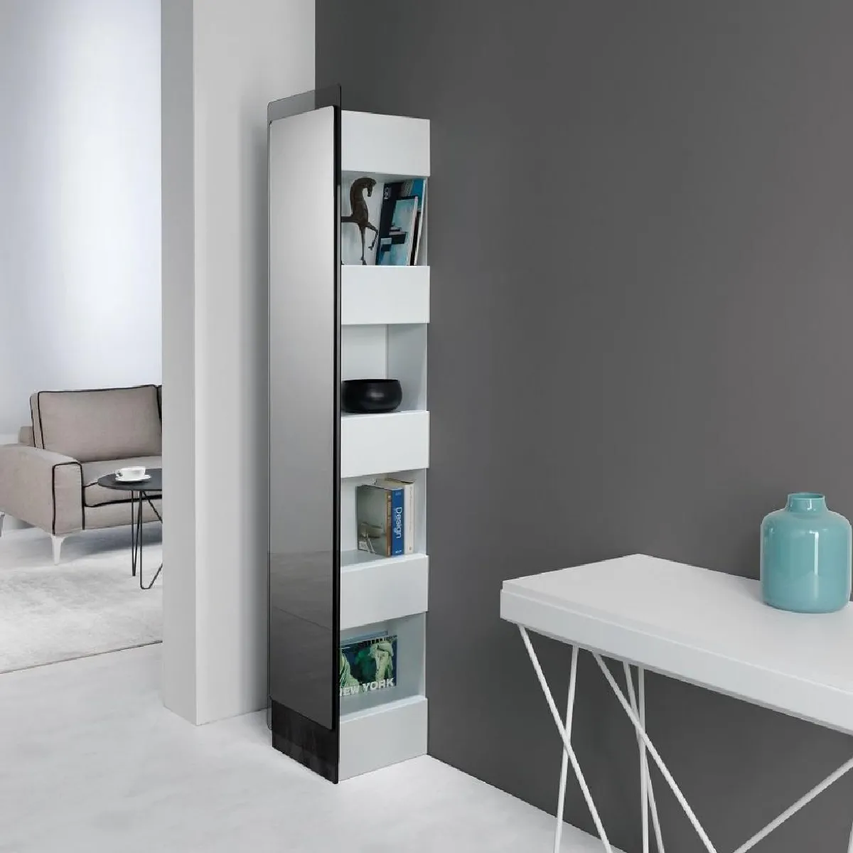 Bibliothèque colonne avec miroir fumé et structure acier blanc
