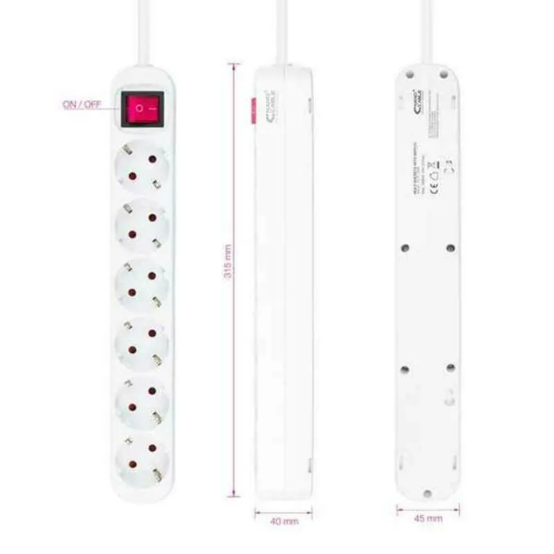 La réglette offre six prises au format Type F avec interrupteur marche/arrêt pour centraliser l'alimentation de vos appareils. Le câble de 1,4 m facilite le positionnement sous un bureau ou près d'un meuble, tout en limitant l'encombrement. Conçue pour un usage intérieur, elle supporte jusqu'à 3680 W sous 250 V à 50 Hz, convenant à divers équipements électriques et électroniques. La couleur blanche s'intègre discrètement dans un environnement domestique ou professionnel.
