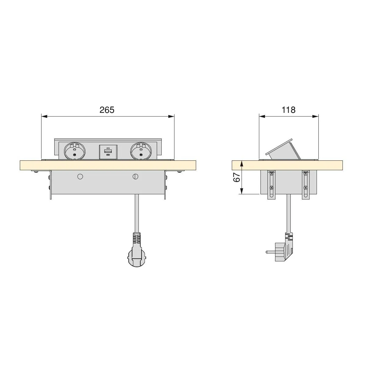 Bloc multiprise encastrable pour bureau - 2 prises Schuko - 2 ports USB A 5V DC - câble 1,5 m - couvercle à bouton poussoir - 230 V - 13 A - jusqu’à 3000 W