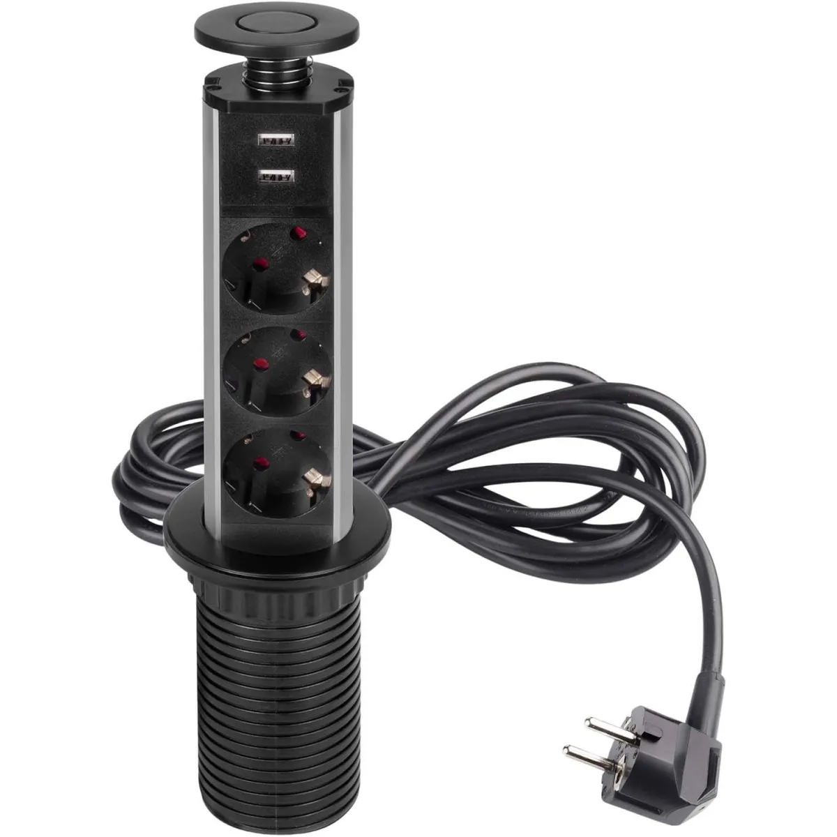 Bloc multiprise encastrable avec 3 prises et 2 ports USB - aluminium - câble 1,8 m - indicateur LED - montage Ø60 mm - 230 V - 16 A - 3500 W