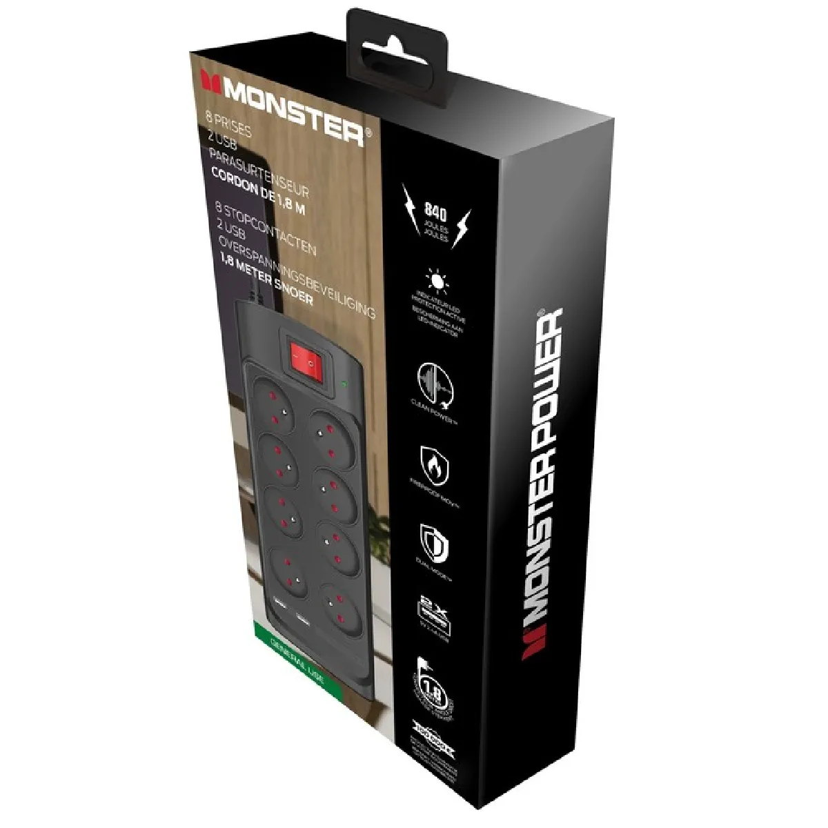 Multiprise parafoudre 8 prises avec 2 ports USB-A - Protection 840 J - MOV - 3680 W - 16 A - Cordon 1,8 m