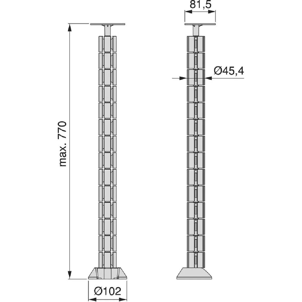Réglable en hauteur jusqu'à 77 cm, elle accompagne différents formats de plateaux et d'équipements. L'installation se fait sous la partie inférieure du plateau grâce aux vis incluses, pour une mise en place stable et rapide. Avec une longueur de 20 cm, une hauteur de 13,50 cm et une profondeur de 15,50 cm, elle assure un passage ordonné des câbles entre le plan de travail et les périphériques, tout en simplifiant la maintenance et le nettoyage autour du poste.