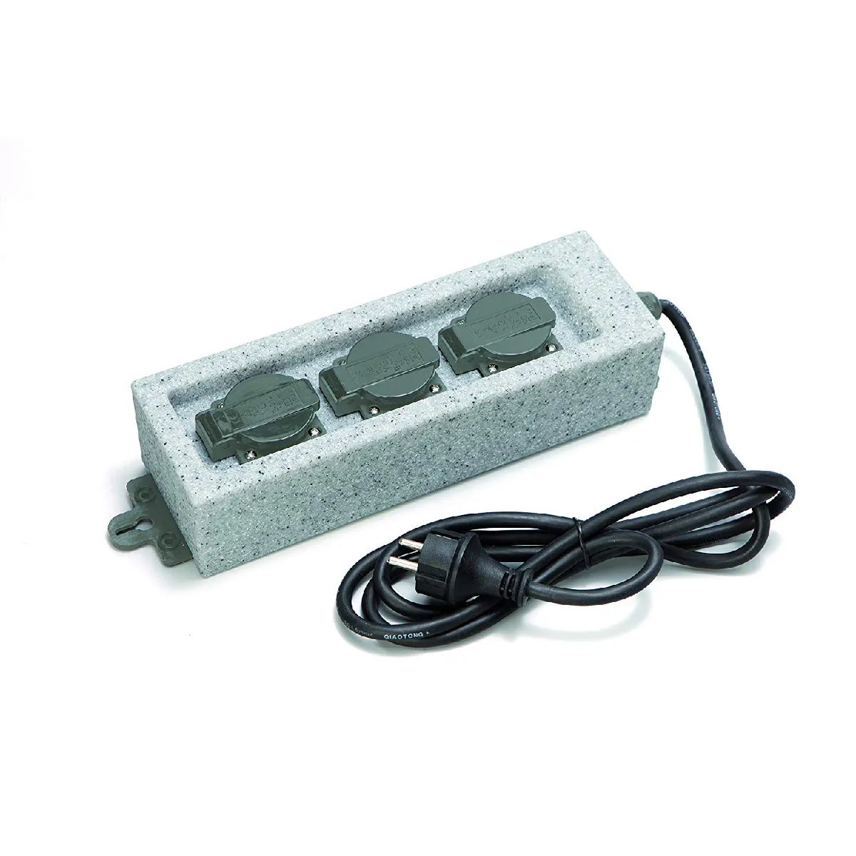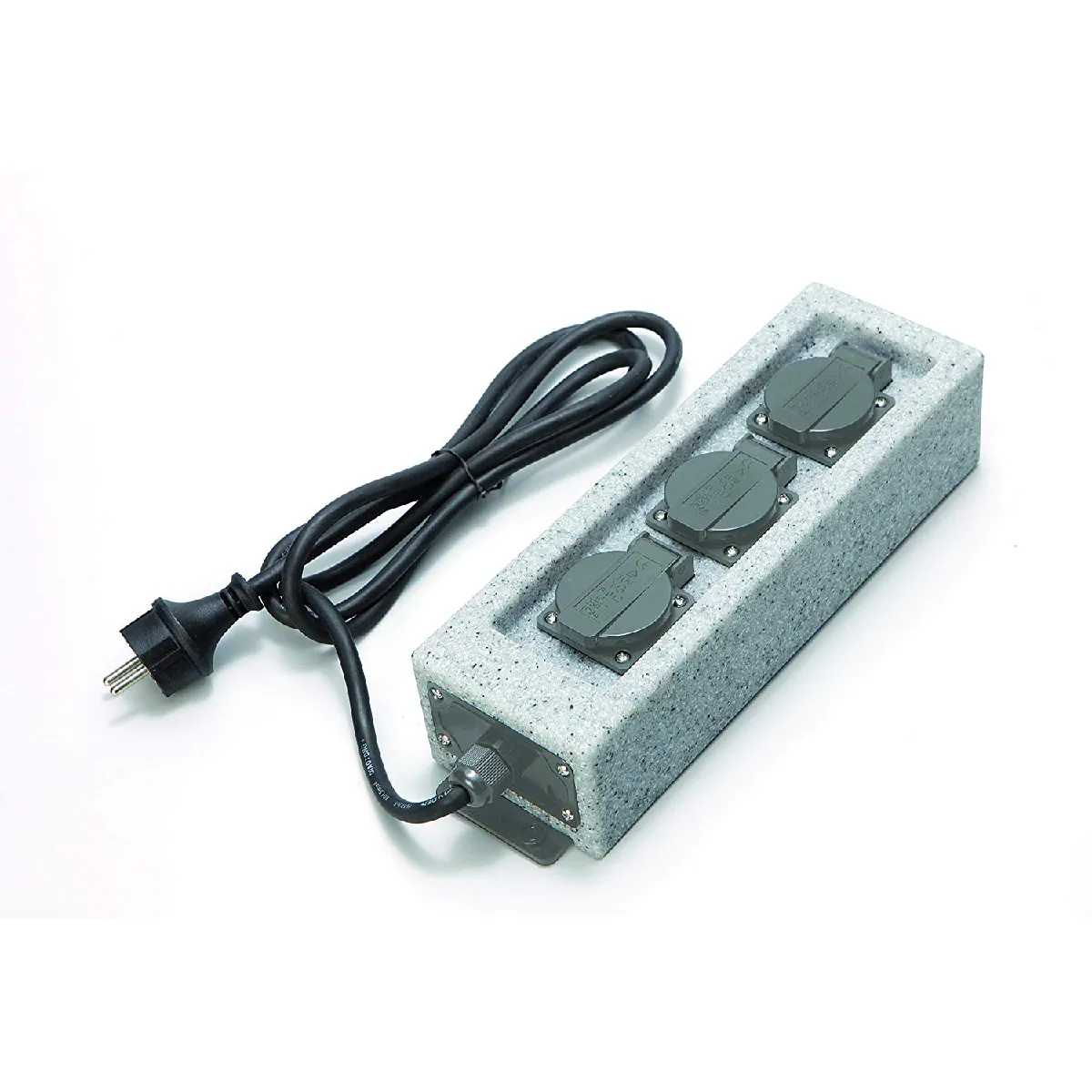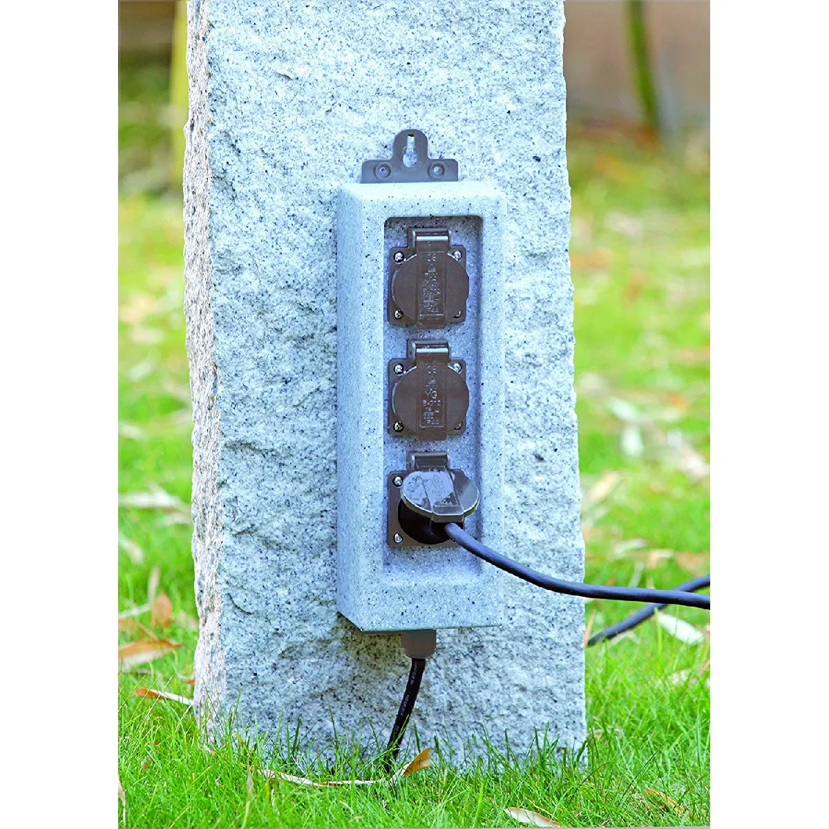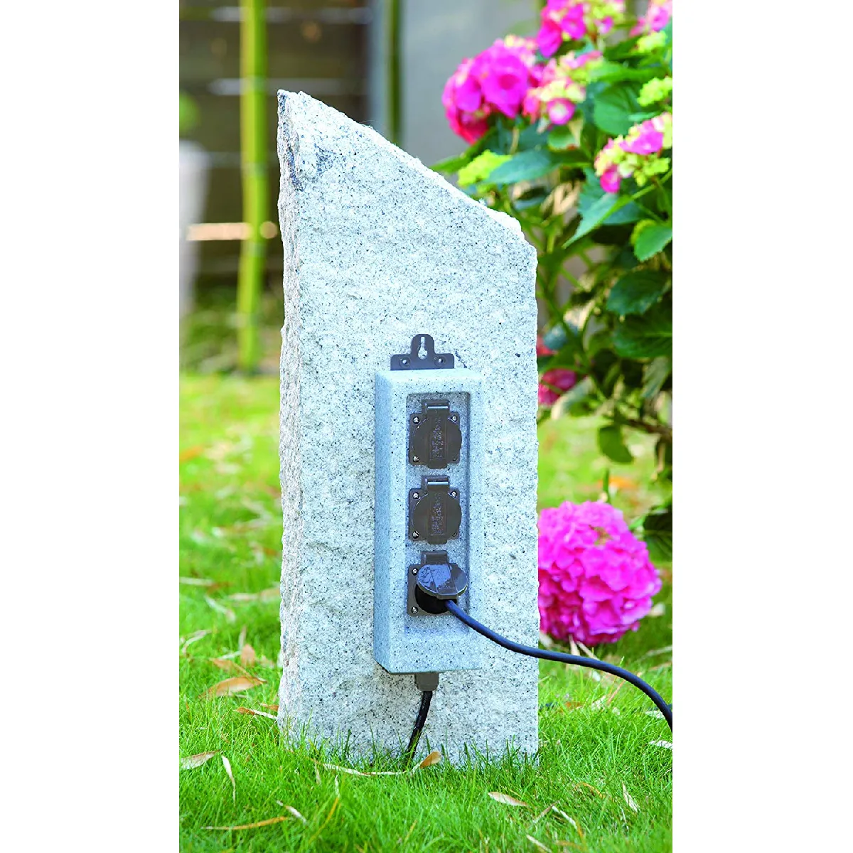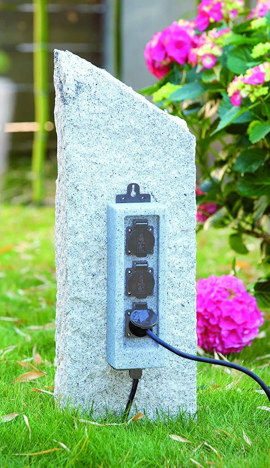 L'installation électrique au jardin gagne en simplicité grâce à trois prises protégées par clapets intégrées dans un boîtier discret de forme pierre. Le câble H07RN-F3G1, 5 mm2 d'environ 1,5 m offre une connexion fiable pour vos appareils extérieurs courants. Avec une puissance de raccordement jusqu'à 3 600 W sous 230 V et 16 A, ce bloc alimente sans effort tondeuse, pompe d'arrosage ou éclairage. Son indice de protection IP44 contre les projections d'eau convient aux utilisations en zone abritée du jardin, de la terrasse ou du balcon.