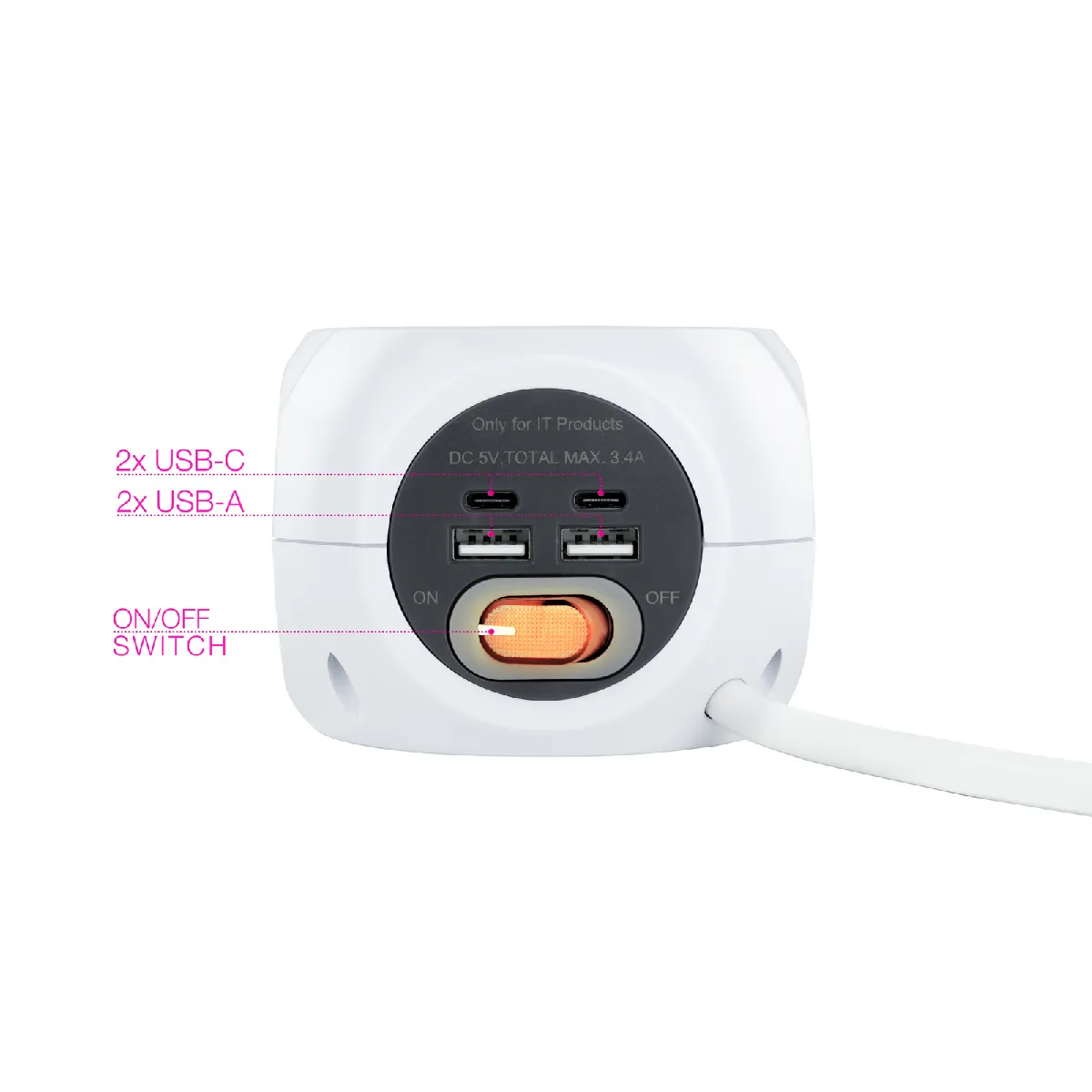 Deux ports USB-C intégrés évitent d'utiliser des chargeurs supplémentaires et libèrent des prises pour d'autres appareils. La présence d'un interrupteur centralisé permet de couper simultanément l'ensemble des prises Schuko, pratique pour réduire la consommation en veille. La réglette au format compact facilite le positionnement au sol ou sur un plan de travail pour une connexion rapide des périphériques courants.