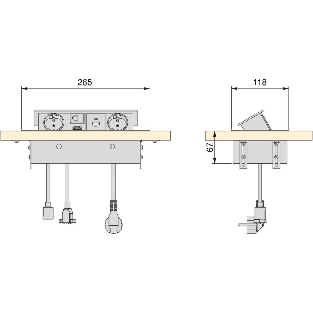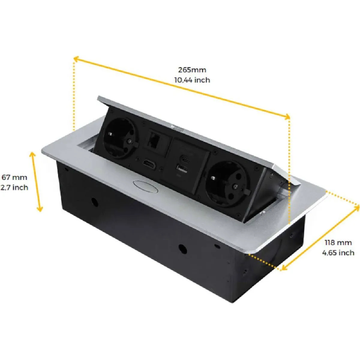 Bloc multiprise encastrable pour bureau - 2 prises EU - HDMI - RJ45 - USB-A et USB-C - Charge rapide - Couvercle à bouton poussoir - Câbles inclus