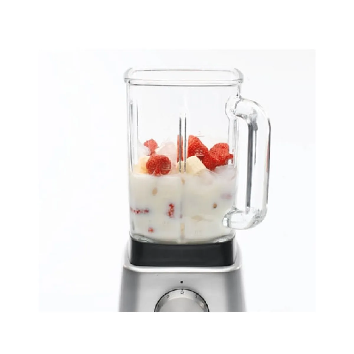 Le bol en verre borosilicate supporte les chocs thermiques, ce qui permet d'alterner sans contrainte entre boissons glacées et soupes chaudes. Les capacités de travail sont encadrées pour un usage maîtrisé : jusqu'à 300 g de glace pilée, 1,8 L de smoothies ou de soupe, et des desserts glacés à partir de 300 g de fruits surgelés ou 4 boules de glace. L'ensemble bol et lames est optimisé pour une circulation fluide des ingrédients, limitant les zones mortes et améliorant la finesse des textures. La base en métal assure une bonne stabilité, complétée par un poids de 5,35 kg qui réduit les vibrations pendant le mixage.