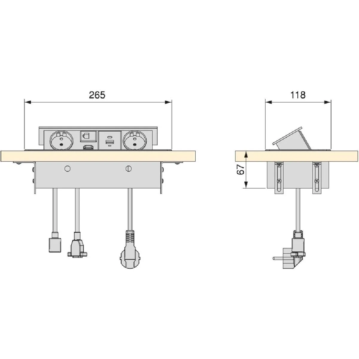 L'intégration dans le plan de travail optimise l'espace tout en offrant alimentation 2 prises jusqu'à 3 000 W - 13 A et connexions de données accessibles. Le couvercle à bouton poussoir avec ouverture propre protège les ports lorsqu'ils ne sont pas utilisés. La charge est facilitée grâce au USB A + USB C à charge rapide avec plage 5 V 3 A, 9 V 2 A, 12 V 1,5 A, utile pour téléphones et accessoires. Le bloc est livré avec câbles de connexion inclus pour périphériques afin de limiter les interventions supplémentaires lors de l'installation.