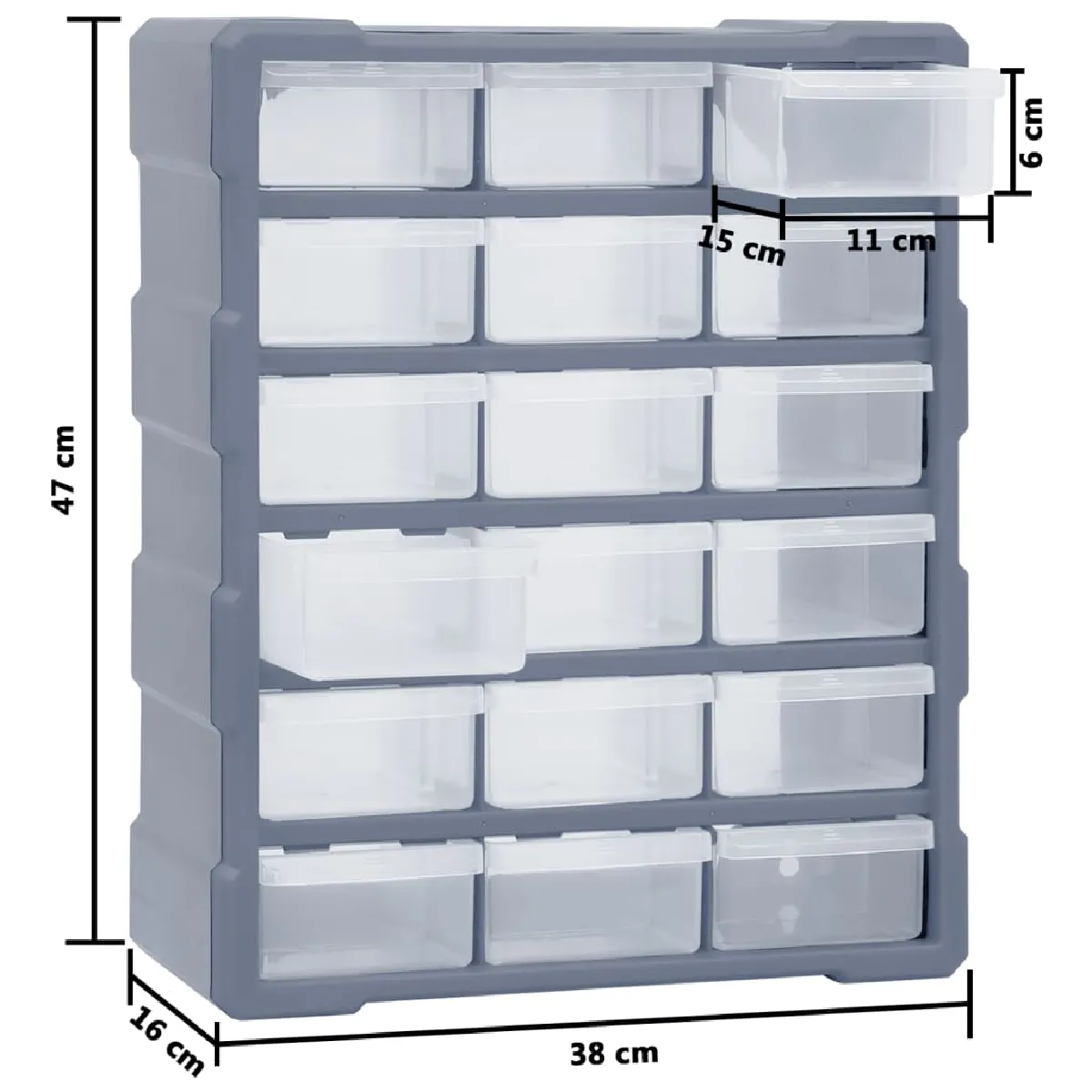 Ce meuble de rangement contient 18 tiroirs centraux pour répondre à vos besoins quotidiens. Il garde vos outils à main et accessoires comme les fixations organisés et à portée de main. Larmoire à outils est fabriquée en plastique résistant aux chocs, qui est à la fois durable et stable. Les tiroirs sont en plastique transparent afin que vous puissiez identifier rapidement le contenu. Cette boîte de bricolage est idéale pour ranger les écrous, les boulons, les vis, les clous, les fixations générales et les composants.