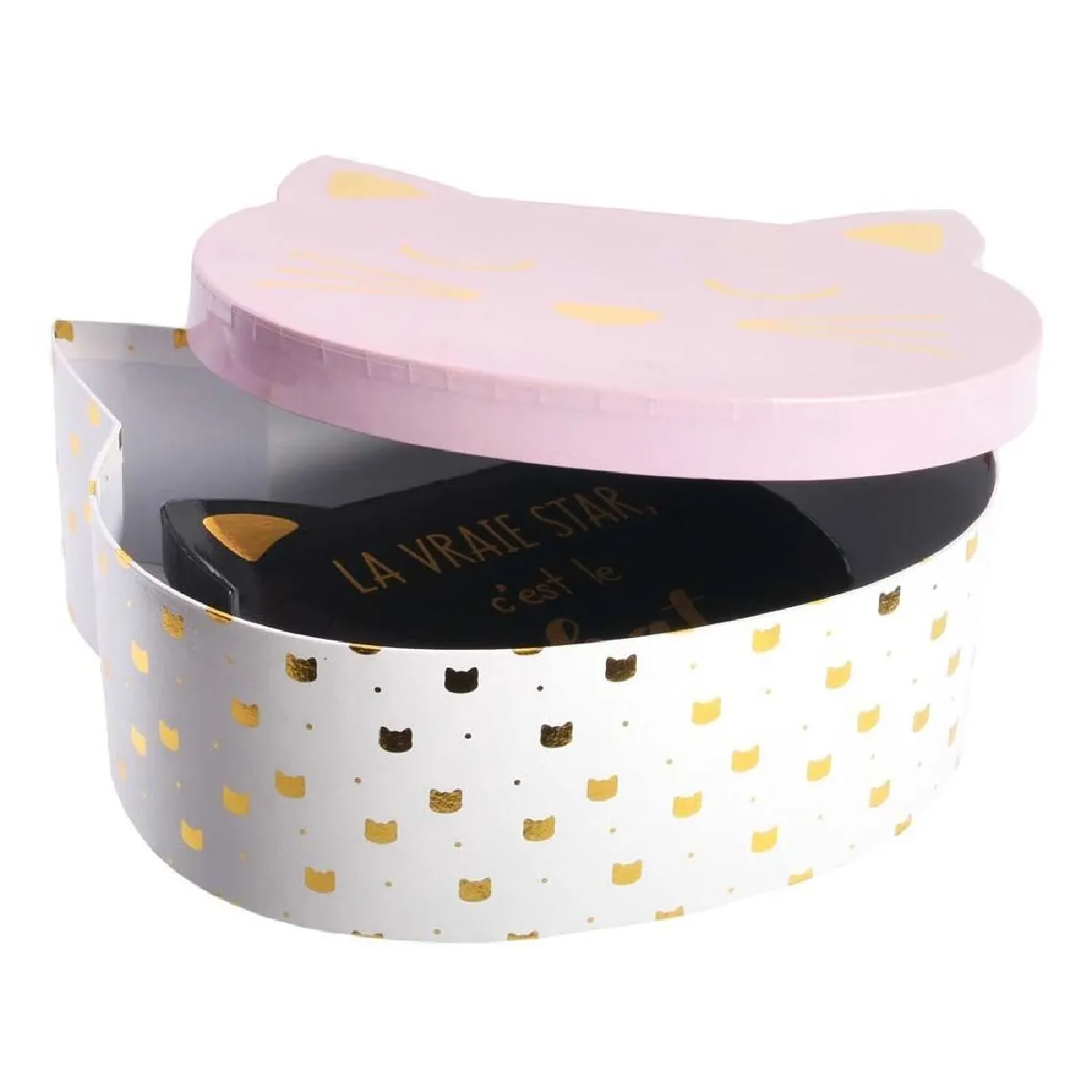 Commentaire vendeur : Informations Techniques : Dimensions : Taille 1 : L. 25 x l. 23 x H. 8,5 cm Taille 2 : L. 16,5 x l. 15 x H. 5,5 cm Matière : Papier Spécificités : Pratique & Utile Boîte de Rangement Forme Chat A Motifs Couleur : Rose & Noir