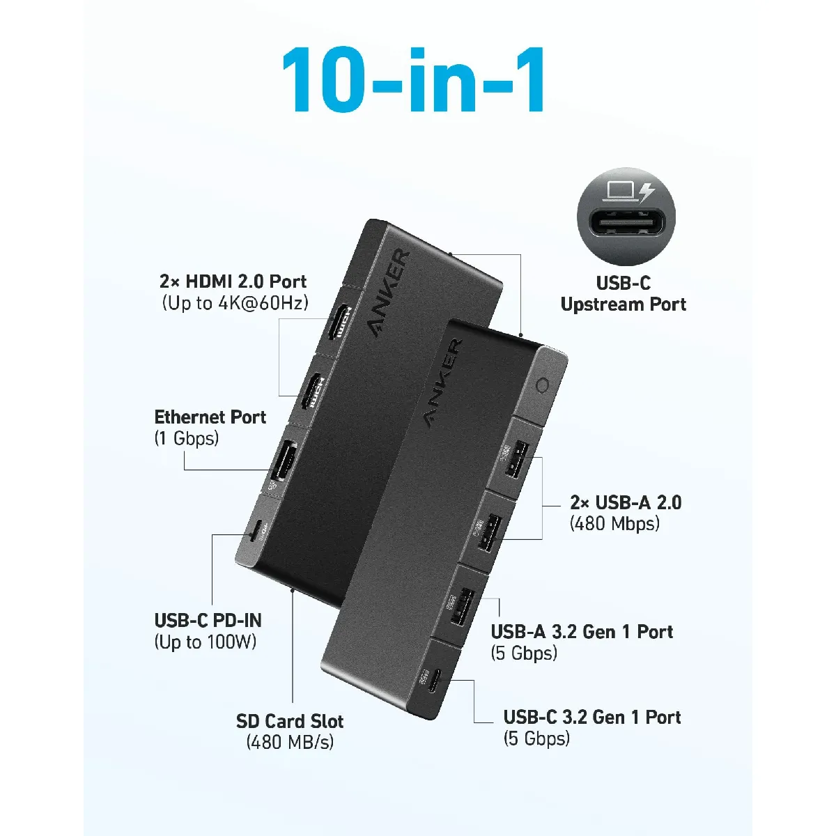 CONNECTIVITÉ 10-EN-1 : Équipé de deux ports HDMI 4K, un port USB-C 5Gbps, un port USB-A 5Gbps, deux ports USB-A 480Mbps/s, un port USB-C PD-IN, un port Ethernet, un emplacement pour carte SD et un port USB-C en amont. DEUX AFFICHAGES : Diffusez ou mettez en miroir du contenu en 4K@60Hz sur un seul appareil ou connectez deux écrans en 4K@30Hz aux deux ports HDMI. TRANSFERT DE FICHIERS SUPER RAPIDE : Les ports USB-C et USB-A vous permettent de transférer des fichiers vers et depuis votre ordinateur portable à des vitesses allant jusqu'à 5 Gbit/s. Vous pouvez également utiliser la fente pour carte SD pour transférer toutes vos dernières photos. CHARGEMENT PASS-THROUGH PUISSANT : prend en charge jusqu'à 85 W de charge pour que vous puissiez charger votre ordinateur portable tout en utilisant le concentrateur. Remarque : la charge directe nécessite un chargeur (non inclus). DANS LA BOÎTE : Hub USB-C Anker 364 (10 en 1, Dual 4K HDMI), manuel d'utilisation, notre garantie de 18 mois et un service client amical.