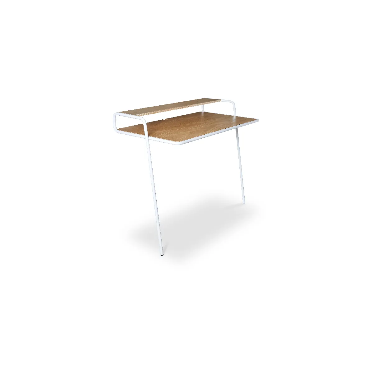 .Ce bureau inclinable moderne est constitué d'une structure métallique et la surface est en contre-plaquée avec une finition en chêne. Il se pose contre le mur et occupe peu de place. Il dispose d'une étagère pour poser une lampe, des stylos et d'autres objets. Vous pourrez placer ce bureau de style scandinave dans une chambre à coucher ou dans le salon car il ne prend pas beaucoup de place. Dimensions : 57 cm x 107 cm x 87 cm (L x l x H)