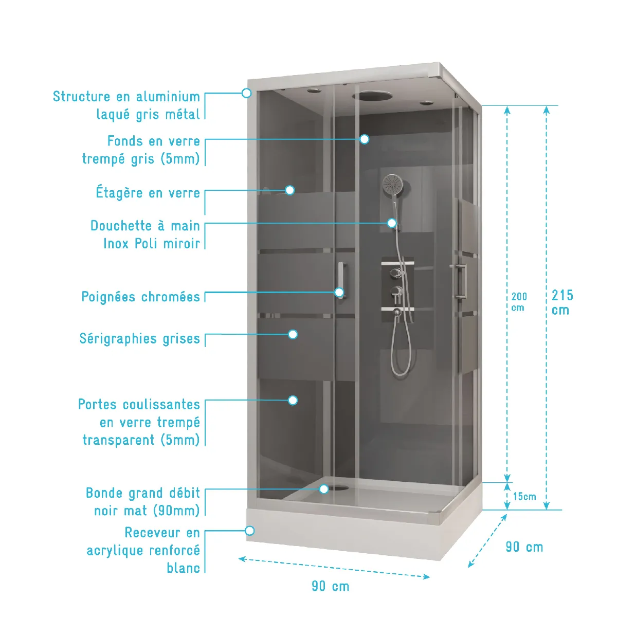 Cabine de douche carrée - 90x90x215 cm - Aluminium laqué gris métal - Portes coulissantes
