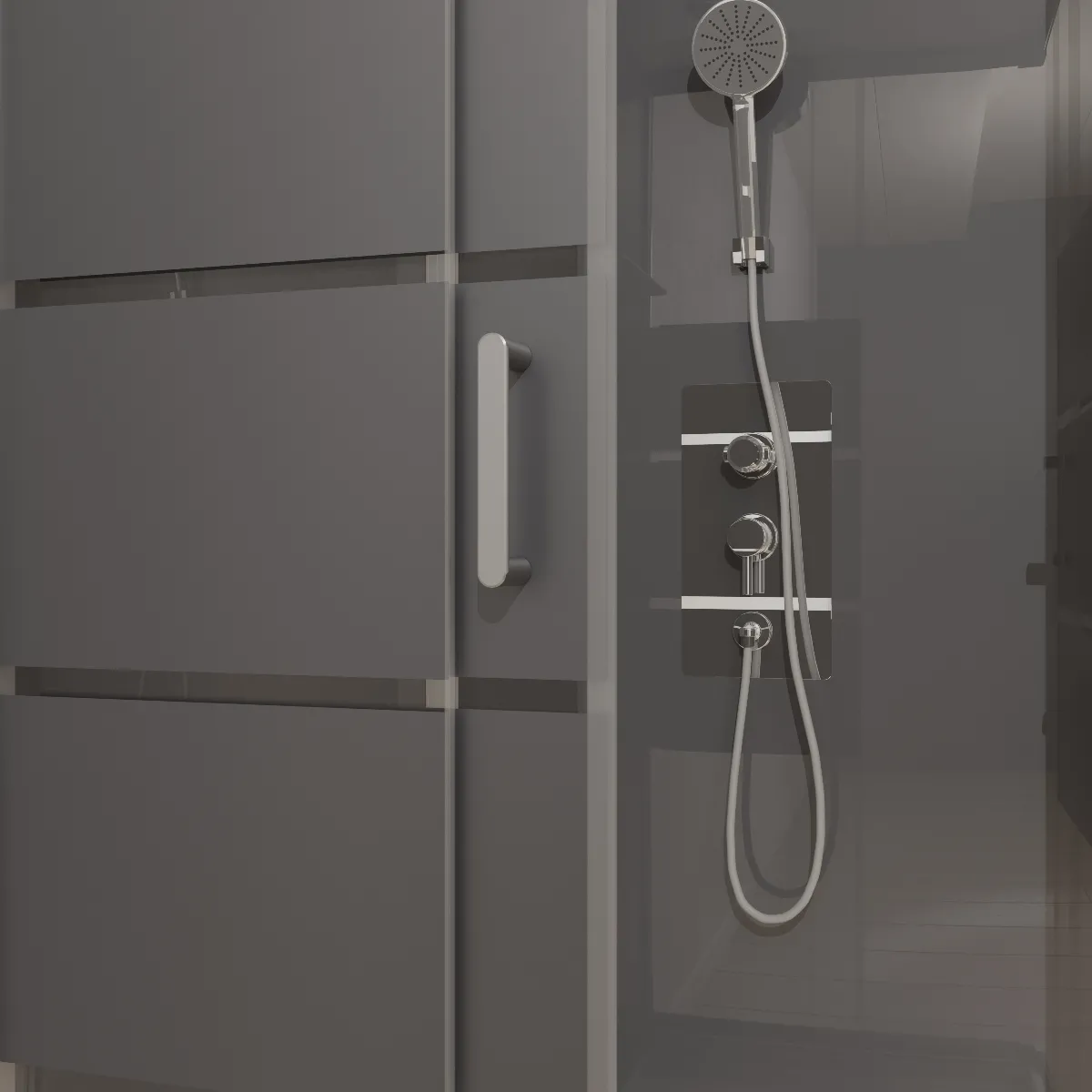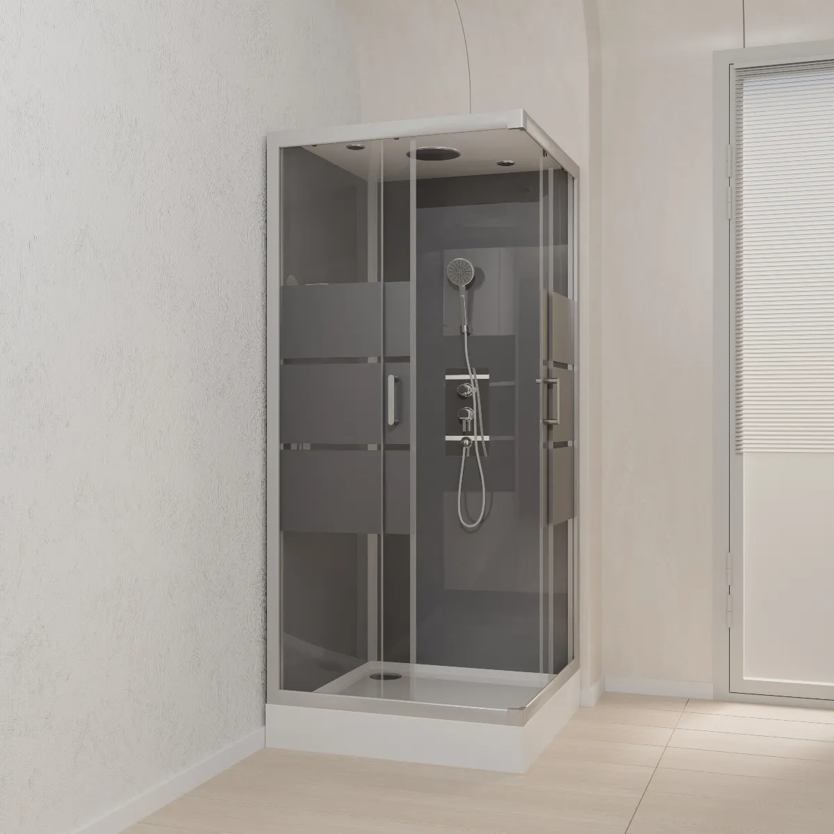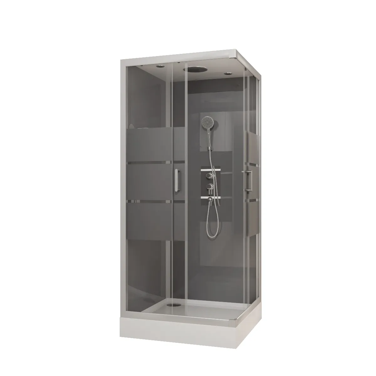 PLUS PRODUIT: For grey lovers ! La cabine SILVERY STRIPE SQUARE se distingue avec sa structure en aluminium laqué gris métal. Profitez d'une grande largeur d'ouverture grâce à la porte coulissante. Fonctionnelles et design, les façades aux bandes dépolies sont la signature de la cabine SILVERY STRIPE. Garantie 2 ans pièces et non main d'oeuvre.