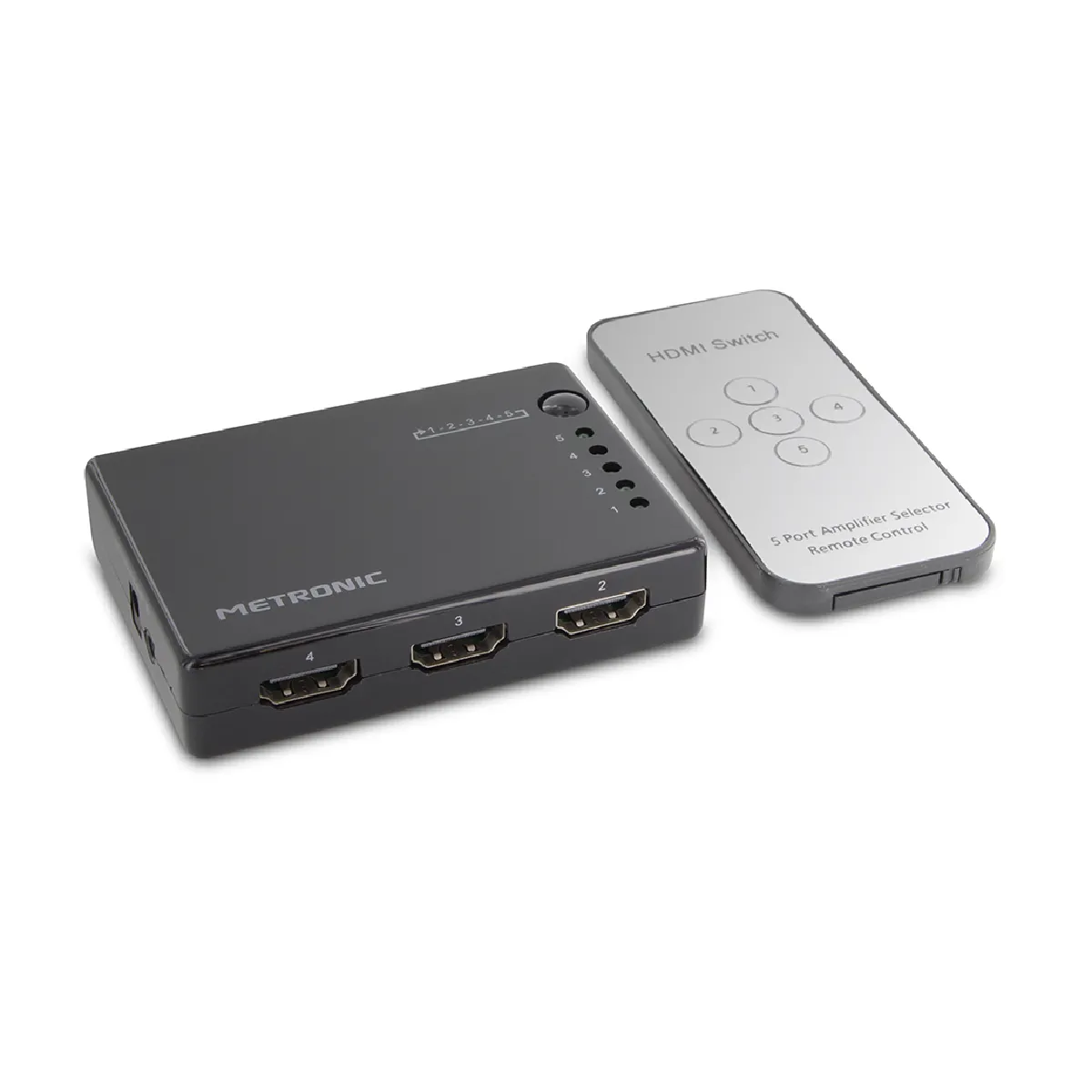 Le switch HDMI 5 ports METRONIC permet de brancher en simultané 5 appareils HDMI à votre TV afin d’éviter les débranchements fréquents. Très pratique, vous pourrez sélectionner la source HDMI à l’aide de la télécommande infrarouge ou avec le bouton situé sur le boitier et passer d’une source à l’autre très facilement. Dès l'allumage de l'un de vos appareils branchés sur le switch HDMI, il sera immédiatement diffusé sur votre télévision. C’est une solution multiport HDMI parfaite pour brancher l’ensemble de vos appareils en simultané.