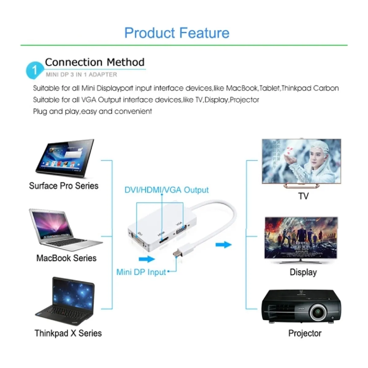 1. Convertisseur mini DP vers HDMI VGA DVI