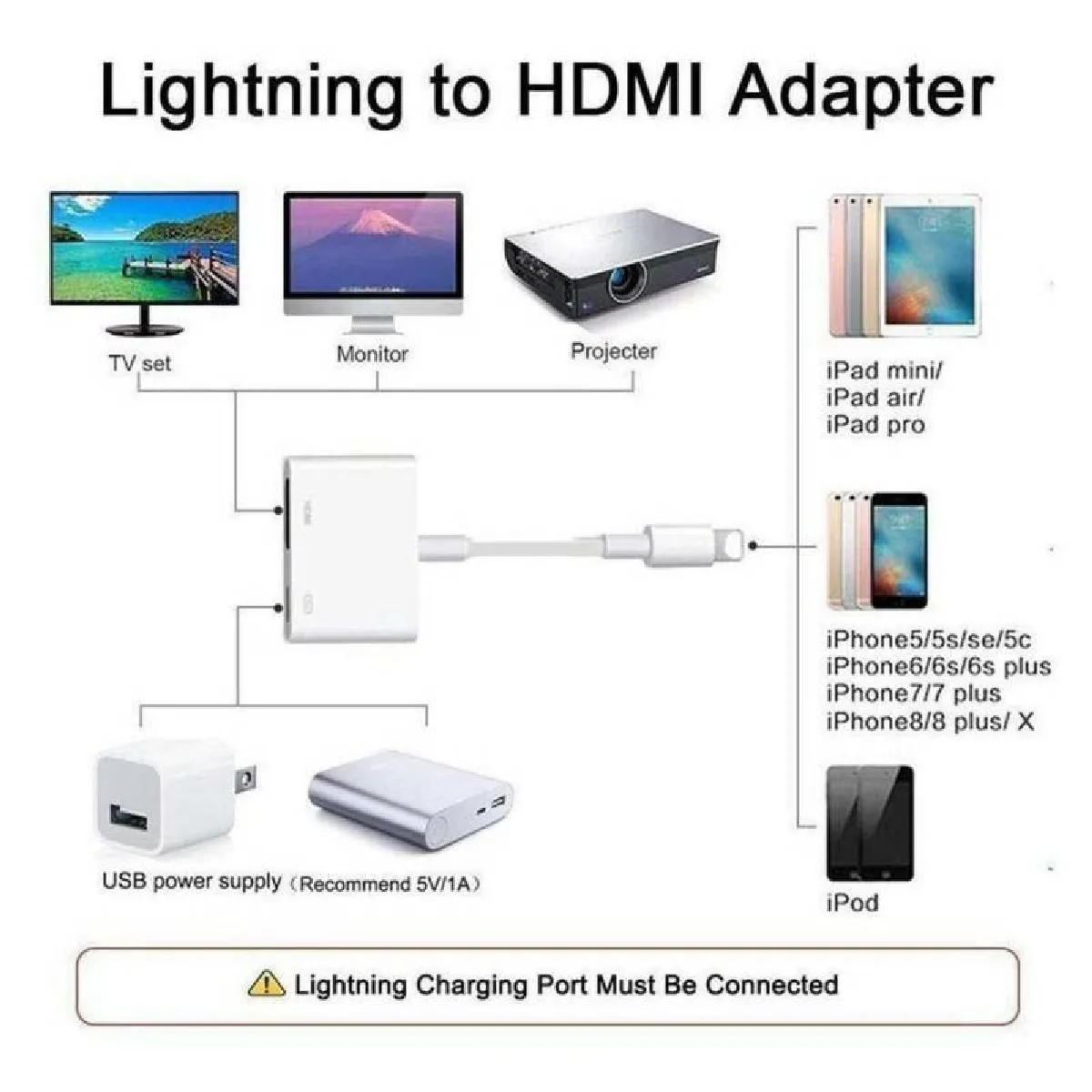 L'adaptateur AV numérique Lightning prend en charge la mise en miroir de ce qui est affiché sur votre écran de périphérique - y compris les applications, les présentations, les sites Web, les diaporamas et davantage - à votre téléviseur, affichage, projecteur ou autre affichage compatible HDMI jusqu'à 1080p HD. Remarque: le câble de chargement USB 5V 1A doit être branché avant utilisation. Comment utiliser: 1. Insérez le câble de foudre dans l'adaptateur secteur USB 5V / 2A. 2. Port HDMI: Connectez-vous à votre écran avec un câble HDMI. 3. Connexion de la foudre: Connectez-vous à votre iPhone, iPad, iPod. Cliquez sur le bouton "Trust" lors de la connexion, puis attendez-le à vous connecter automatiquement. Applications pris en charge: Tube Tube, Hulu Plus, IDMB, Quickflix, Famille à la télévision, ABC, NBC, FOX et Vidéos locales. Dispositifs compatibles: iPhone X, iPhone XS, iPhone XS MAX, iPhone XR, iPhone 8, iPhone 8 Plus, iPhone 7, iPhone 7 Plus. iPhone 6s, iPhone 6S Plus, iPhone 6, iPhone 6 Plus. iPhone 5, 5C, 5s, SE. Ipad Air, iPad avec affichage de la rétine. iPad Mini, iPod Touch 5ème Gen et iPod Nano 7th Gen. Emballage inclus