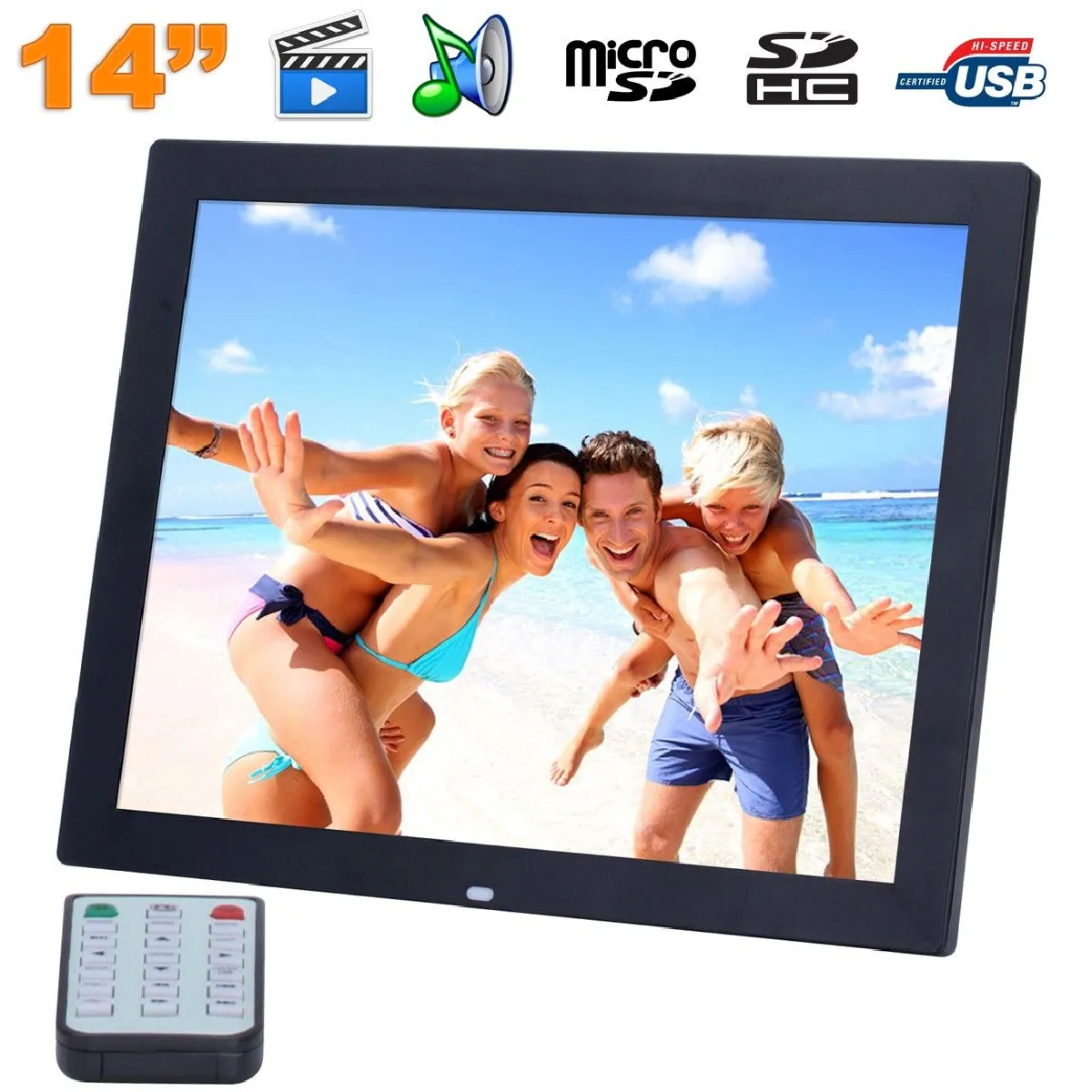 Ce cadre photo numérique 14 pouces HD LED vous permet de visionner vos plus belles photos en format numérique HD, en diaporama, ainsi que vos vidéos et films et même écouter votre musique. Ce gadget tout-en-un est contrôlable à distance grâce à sa télécommande et peut être posé aussi bien sur une commode ou accroché sur un mur grâce à ses différents moyens de fixation. Couleur : Noir. Dimensions cadre: 35,2 x 24,8 x 2,7 cm Dimensions écran : 31 x 20.5 cm