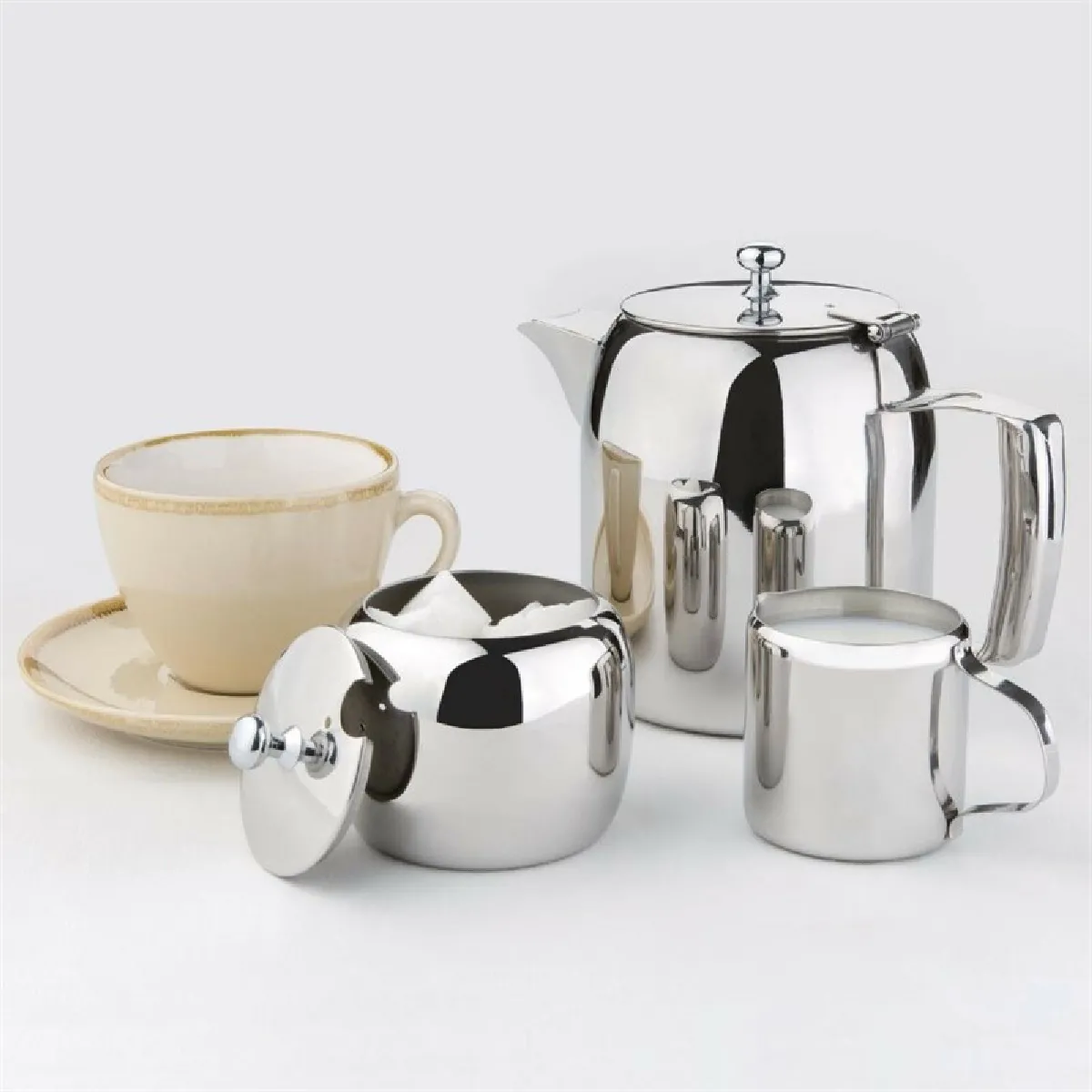 Le corps en inox avec finition miroir hautement polie améliore la visibilité et la présentation sur table. Le bec anti-goutte de grande taille permet un service précis limitant les éclaboussures, utile pour préserver nappes et plans de travail. La poignée isolante apporte une prise sûre et confortable, réduisant le risque de contact avec des surfaces chaudes pendant les rotations rapides en salle ou au bar.