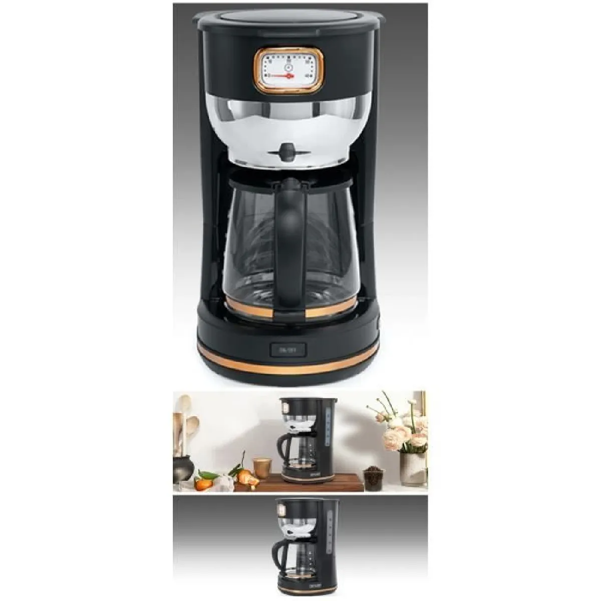 Le style noir doré met en avant une esthétique rétro vintage pour une cuisine chaleureuse. La structure en plastique facilite la prise en main et l'entretien au quotidien. La carafe adaptée à la capacité de 1.4 L assure un service fluide pour plusieurs tasses successives. Sans mousseur à lait, l'appareil se concentre sur une fonction essentielle : préparer un café filtre simple et régulier, prêt à être dégusté nature ou agrémenté selon vos goûts.