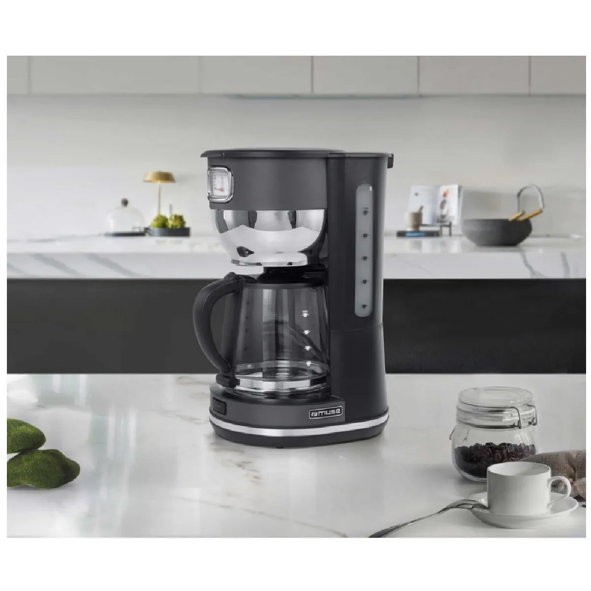 Le filtre s'insère dans un portefiltre amovible, ce qui facilite le rinçage et prévient l'accumulation de dépôts. La verseuse en verre pour une visibilité immédiate aide à doser les quantités, et le service sans coulure grâce à l'antigoutte maintient la zone propre. Le bouton On/Off lumineux confirme d'un regard l'état de fonctionnement, utile dans les cuisines animées. L'absence d'écran rend la navigation intuitive et réduit les manipulations superflues.