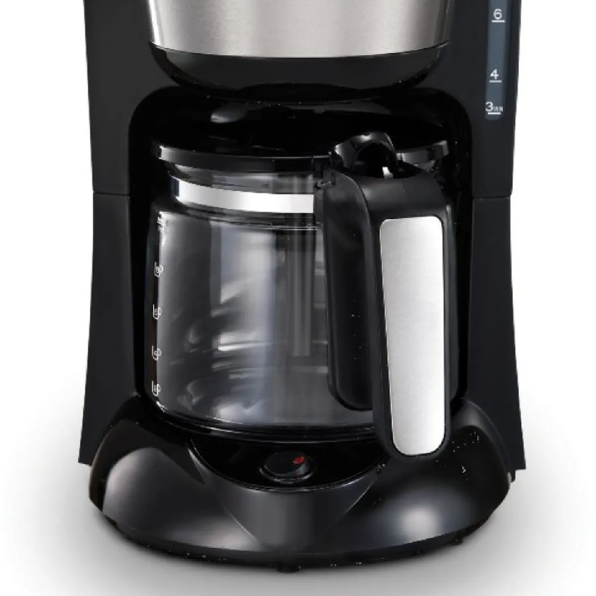 La préparation du petit-déjeuner gagne en efficacité grâce à la fonction d'infusion rapide et au maintien au chaud de 25 minutes. Cette cafetière filtre de 1,25 L offre une capacité familiale de 12 tasses avec verseuse en verre trempé anti-choc. Le filtre permanent réutilisable limite les consommables, tandis que le système anti-gouttes et le porte-filtre amovible facilitent les manipulations au quotidien. Dotée d'un indicateur de niveau d'eau et d'un voyant de mise en marche éclairé, elle délivre une puissance de 1000 W pour des cafés réguliers et homogènes. Son habillage inox et noir s'intègre facilement dans la cuisine sans encombrer, avec un format compact.