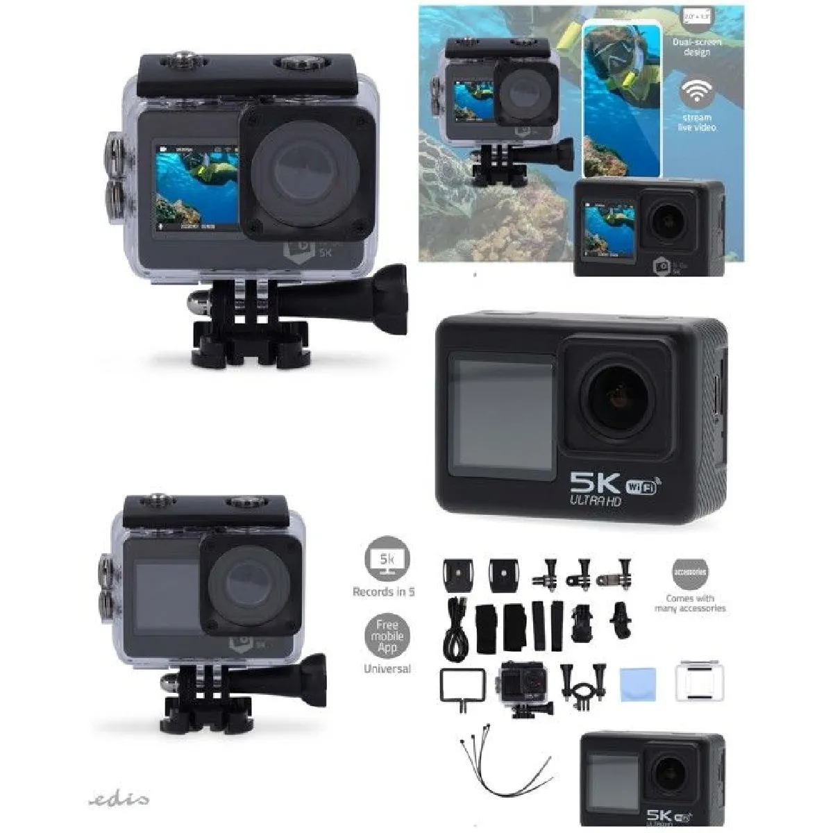 Découvrez la caméra d'action NEDIS 5K avec double écran et WiFi intégré. Avec une résolution photo de 16 MP et un angle de vue de 170°, elle est étanche jusqu'à 30m. Compatible avec les cartes microSD jusqu'à 128 Go, elle inclut un kit de montage complet et un microphone intégré pour partager vos aventures..
