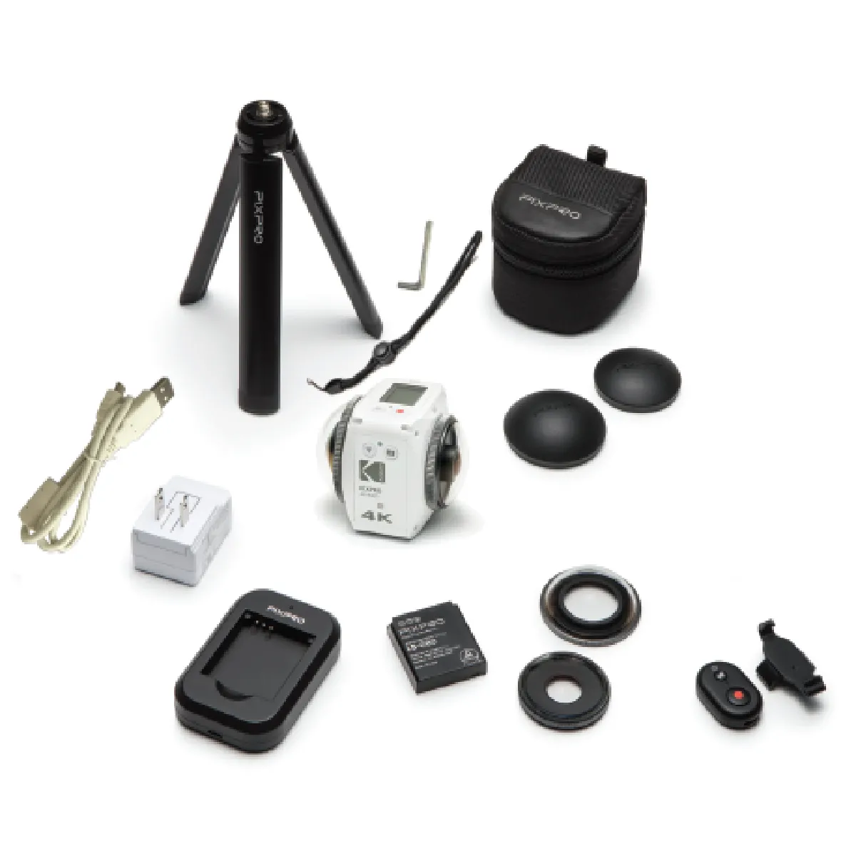 La Caméra KODAK PIXPR0 4KVR360 VR adopte une démarche minimaliste pour une caméra VR à 360?. avec deux lentilles fixes de focalisation logées par un corps futuriste de caméra. Chaque lentille incurvée est conçue pour fonctionner en tandem. pour capturer une vidéo à 360? 4K( résolution de 8 millions de pixels minimum à un rapport hauteur/largeur de [1:1]) et pour télécharger facilement des vidéos et des photos à 360? sur des plateformes de réseaux sociaux comme Facebook™ et YouTube™ par l'appli Smart Device de la caméra à la volée. Caméras numériques KODAK PIXPRO - Racontez Votre Histoire! - Capteur doubles 20MP CMOS - Trois angles à prise de vue multiple : Sphérique à 360° / Mode VR. Mode Ultra Large '-197° 4K. Mode dôme '-235° - Compatible avec les cartes Micro SD jusqu'à 256Go. Ce kit comprend la caméra. Lens Cover-BetC. Protective Cove-BetC. Batterie Li-ion et son chargeur. un cable USB. un adapteur AC. un étui de transport. Mini BLUETOOTH Remote Control. Remote Control Mount-B. Small 3-Leg Stand-B. carte de garantie et un guide de démarrage.