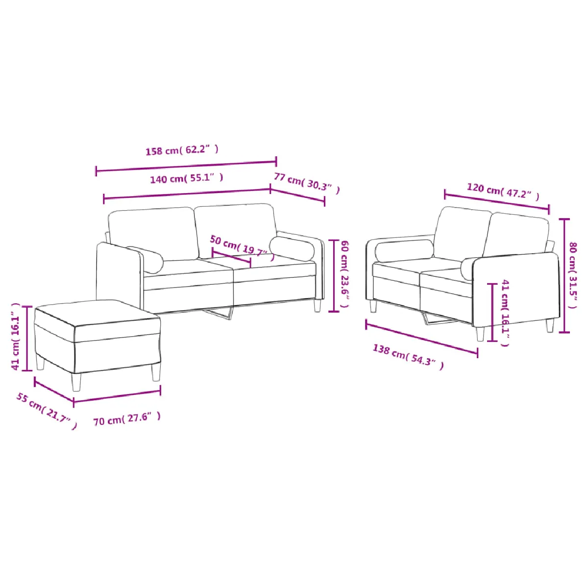 Ensemble de canapés - 3 pièces - Revêtement velours gris clair - Structure métal et contreplaqué - Oreillers inclus