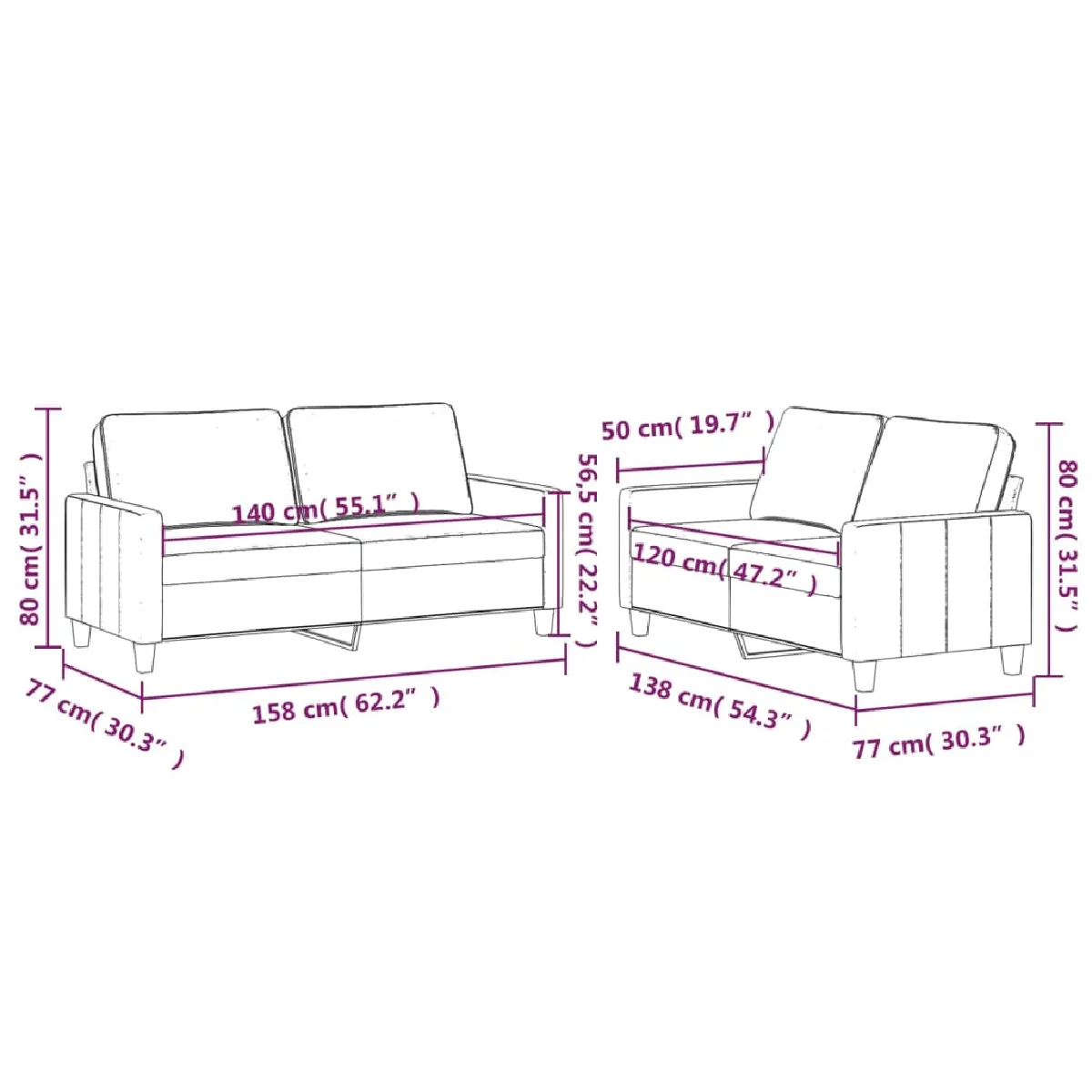 Ensemble de canapés - Velours doux - Structure métal - Dimensions petites et grandes variant largeur