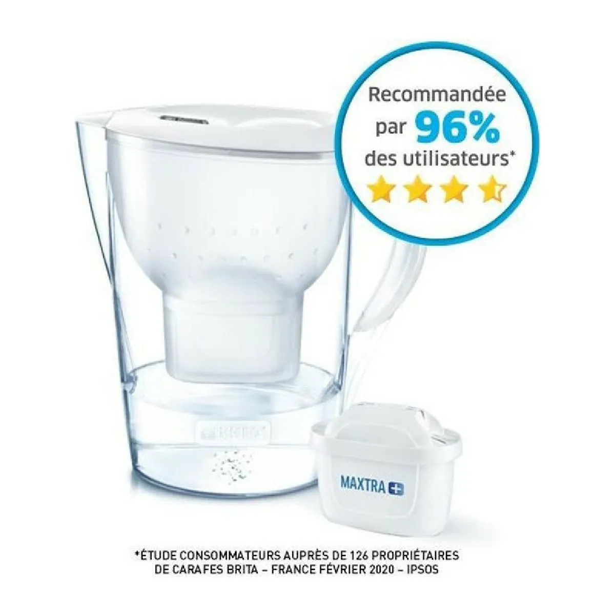 - Cartouche fournie, durée indicative jusqu'à 100 l ou environ 1 mois selon l'utilisation