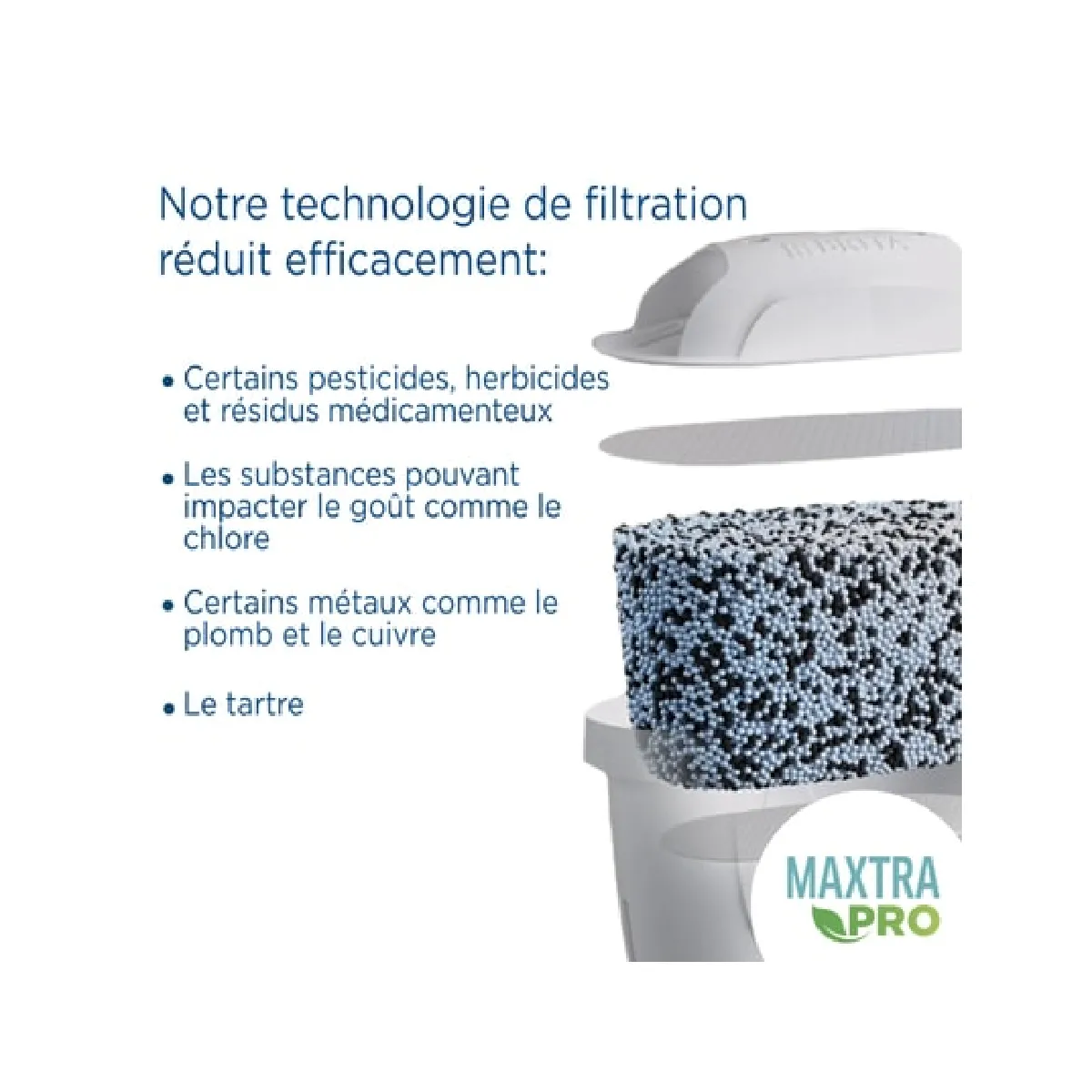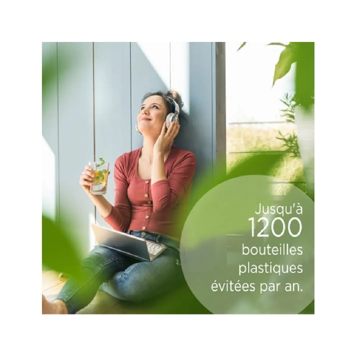 L'amélioration du goût de l'eau du robinet s'obtient ici grâce à une filtration MAXTRA PRO associant charbon actif d'écorces de noix de coco et perles échangeuses d'ions. Cette carafe offre une capacité totale de 3,5 l et un volume d'eau filtrée de 2,1 l, adaptée aux besoins quotidiens d'un foyer. Le filtre All-in-1 réduit le chlore, certains pesticides, herbicides et résidus médicamenteux, ainsi que le tartre et des métaux comme le plomb et le cuivre. La conception sans BPA ni phtalates s'accompagne d'éléments en plastique biosourcé à 50 % pour le couvercle et la coque du filtre. Un indicateur de changement de cartouche aide à maintenir une qualité de filtration régulière.