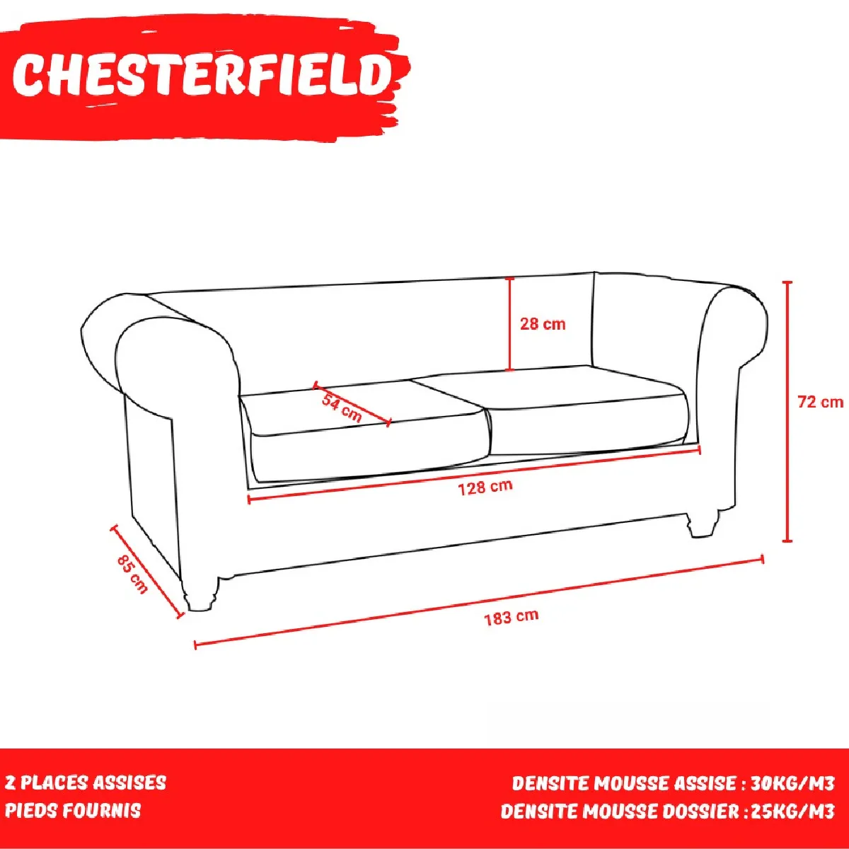 Commentaire vendeur : Canapé CHESTERFIELD 2 places / GrisLe canapé Chesterfield est un incontournable des décorations à l'anglaise. Avec son revêtement doux capitonné aux jolis reflets et son rembourrage en mousse, il apporte du charme, de l'élégance et une touche rétro à votre salon.Caractéristiques :Revêtement tissu Gris2 coussins amoviblesDensité mousse assise : 30kg/m3Densité mousse dossier : 25kg/m3Hauteur dossier : 28 cmDimensions hors tout :183x85x72 cmDimensions assise : 128x54x46 cmHauteur des pieds : 9 cmHauteur coussin : 14 cmDimensions:183x85x72