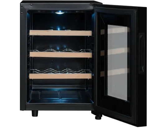 Idéale pour garder quelques références à portée de main, cette cave de service maintient les vins à température stable entre 11 °C et 18 °C. Son format compact et sa pose libre facile à intégrer dans une cuisine, un salon ou un bureau en fait un appareil pratique au quotidien. Le thermomètre digital à affichage blanc permet un contrôle précis, tandis que l'éclairage LED blanc avec interrupteur met en valeur les étiquettes sans chauffer. Avec un niveau sonore de 26 dB pour un fonctionnement discret, elle accueille jusqu'à 12 bouteilles sur ses clayettes amovibles et reste simple à régler grâce à sa régulation électronique.