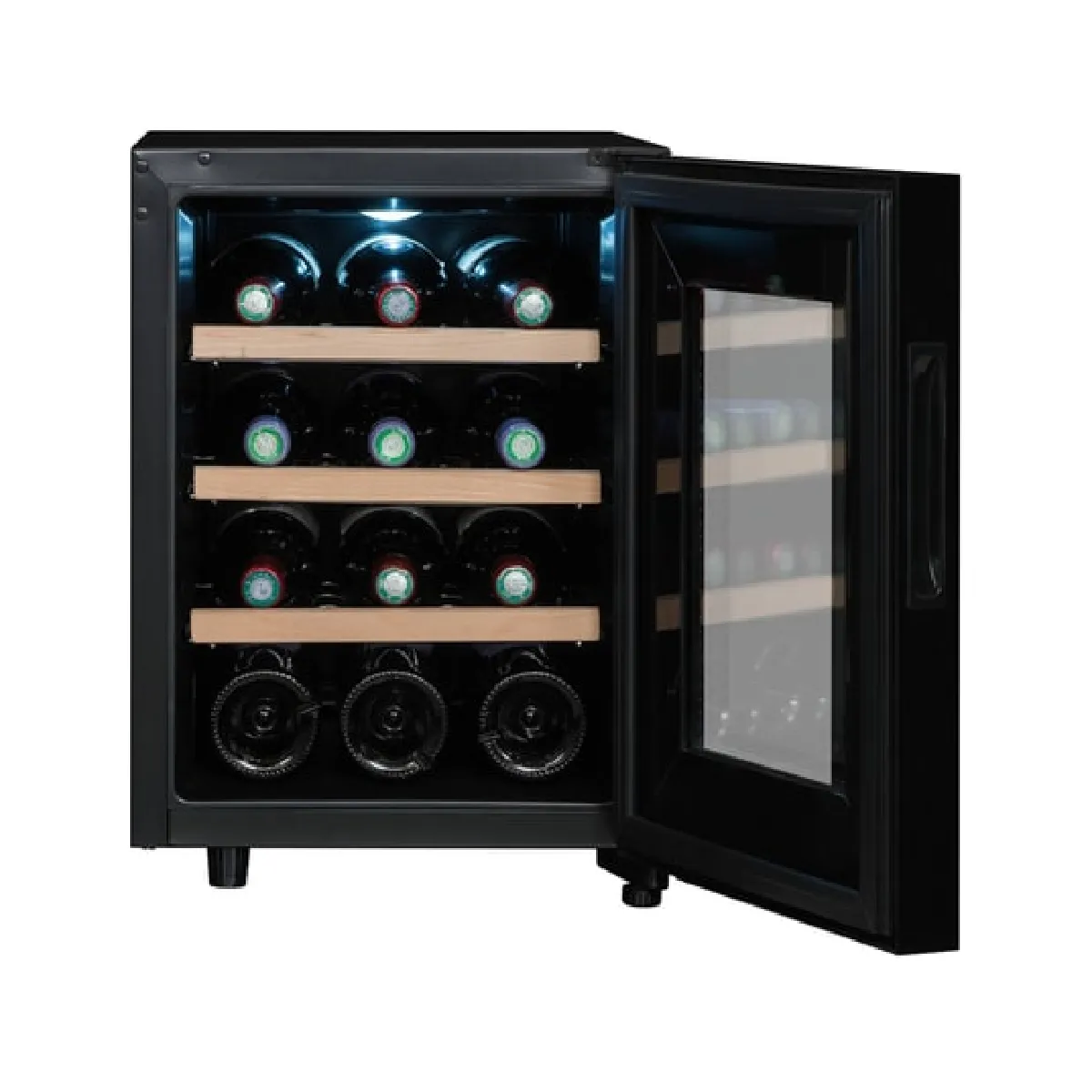 La CC12F offre une capacité de 12 bouteilles dans un encombrement réduit : 34,5 × 46 × 48 cm (L × P × H). Cette taille facilite son installation en pose libre, sur un plan ou dans un meuble ouvert. Le froid statique est piloté par une régulation électronique pour une température maîtrisée de 11 °C à 18 °C, adaptée au service de vins rouges, blancs ou rosés. Le thermomètre digital à affichage blanc assure une lecture claire.