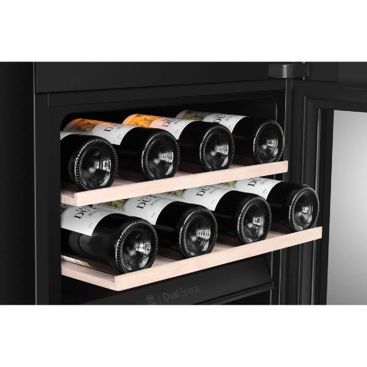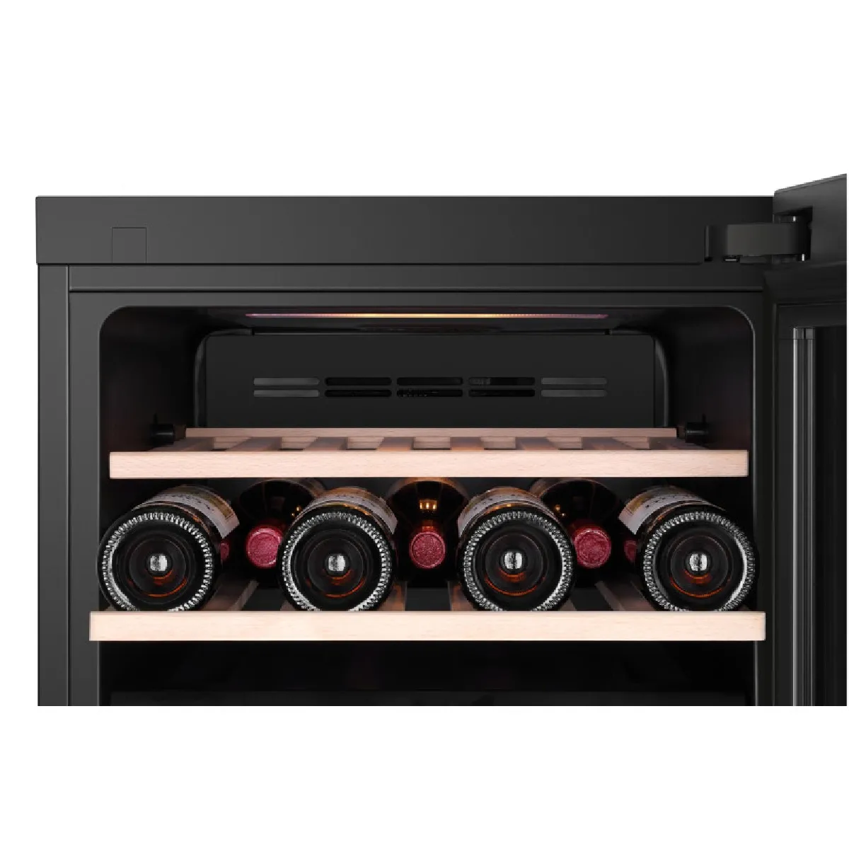 Le volume de 106 l accueille jusqu'à 42 bouteilles sur 3 clayettes en bois. Les supports en bois limitent les vibrations et facilitent le positionnement régulier des bouteilles sur plusieurs niveaux. L'éclairage intérieur aide à identifier chaque cuvée sans ouvrir longuement la porte. Grâce à la porte vitrée, le contenu reste visible tout en conservant un accès rapide, utile pour le service. Le niveau sonore de 37 dB convient à un salon ou à une salle à manger, pour une présence discrète au sein d'un espace de vie.