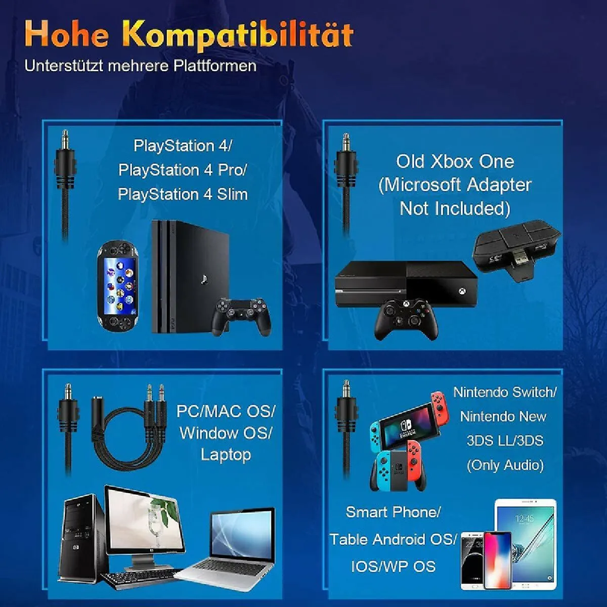 ?Super compatibilité? Ce casque prend en charge les appareils PS4, PS Vista, Nintendo Switch, Nintendo New 3DS, Xbox, PSP, ordinateur portable, PC, Mac et appareils mobiles/tablettes. Un adaptateur Microsoft supplémentaire est nécessaire (non fourni) pour la connexion avec un contrôleur Xbox One ancienne version