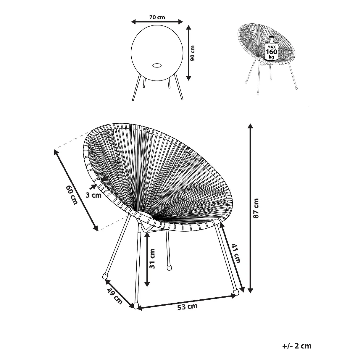 Fauteuil bas en polyrotin. Ce joli siège influencé par le design classique mexicain rafraîchira tout espace de vie intérieur et extérieur. Sa surface d'assise généreuse et colorée présente un tissage de cordes. La base à trois pieds construite en acier robuste assure une stabilité totale. Cette chaise fonctionnera avec brio comme pièce d'accent pour tout décor extérieur rétro ou contemporain, mais aussi comme meuble de salon intérieur. Détails: Type de produit: Fauteuil coin lecture Style: Boho Couleur principale: Jaune Type de matière: Polyrotin Matière principale: Polyrotin Matière secondaire: Acier Matière du piétement: Métal Matière de l`assise: Rotin Accoudoirs: Non Finition: Revêtu de poudre Pliable: Non Empilable: Non Dimensions: Profondeur: 90 cm Hauteur du siège: 41 cm Largeur: 70 cm Hauteur: 87 cm Poids: 5 kg Charge admise: 160 kg L`offre inclue: 1 x Chaise Caractéristiques clés: Pieds stables, solides et élégants, Assise profilée profonde, À la fois pour l'intérieur et l'extérieur, Assemblage facile, autonome, Des patins pour les pieds assurent la protection contre les rayures, Léger et facile à transporter Informations d`assemblage: Pieds à monter. 5 - 15 min Informations supplémentaires: Attention ! Ne pas ouvrir l'emballage avec un objet pointu ou coupant qui risquerait d'endommager le produit. Pour garantir la stabilité de la construction et la sécurité d'utilisation, il est recommandé de vérifier si le produit a été correctement assemblé 2 semaines après son installation. Il est également recommandé de vérifier que les vis sont correctement serrées tous les 3 mois. Texte sur la résistance: Les meubles résistants aux rayons UV présentent une résistance accrue à la décoloration. Cependant, afin de prolonger sa longévité, nous recommandons de conserver le produit sous abri lorsqu'il n'est pas utilisé. Résistance: Humidité Conseils de maintenance: Polyrotin: 1.Nettoyez avec des détergents à base de savon. N'utilisez pas de nettoyants chimiques agressifs 2.Les ustensiles ou accessoires en verre peuvent surchauffer la surface 3.Pour prolonger la durée de vie de vos meubles, protéger-les contre toute exposition directe au soleil 4. Acier: 1.Un nettoyage régulier et le stockage à l'abri de l'eau et de l'humidité augmentent la durabilité de vos meubles de jardin 2.Nettoyez avec des nettoyants doux disponibles dans le commerce 3.Pour protéger vos meubles contre la corrosion, évitez les nettoyants alcalins ou acides. Après le nettoyage, bien essuyer 4.Lorsqu'ils ne sont pas utilisés, les meubles doivent être stockés à l'intérieur ou sous une housse de protection. Cela n'est pas nécessaire si le meuble est en acier galvanisé 5.Enlevez régulièrement les capuchons de protection pour évacuer l'eau, laissez sécher et utilisez un spray anti-corrosion si nécessaire 6.Protéger de l'humidité chaque endroit où la couche de peinture extérieure a été endomagée 7.N'oubliez pas que cet article ne doit pas entrer en contact avec de l'eau, car de l'eau rouillée pourrait s'écouler par le centre des tubes du cadre. Cela ne s'applique toutefois pas aux meubles en acier galvanisé, qui présentent une résistance accrue à la corrosion grâce au processus de galvanisation.