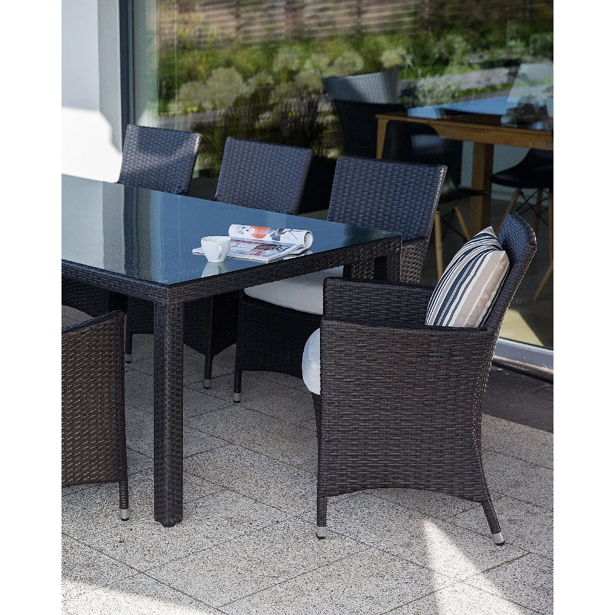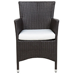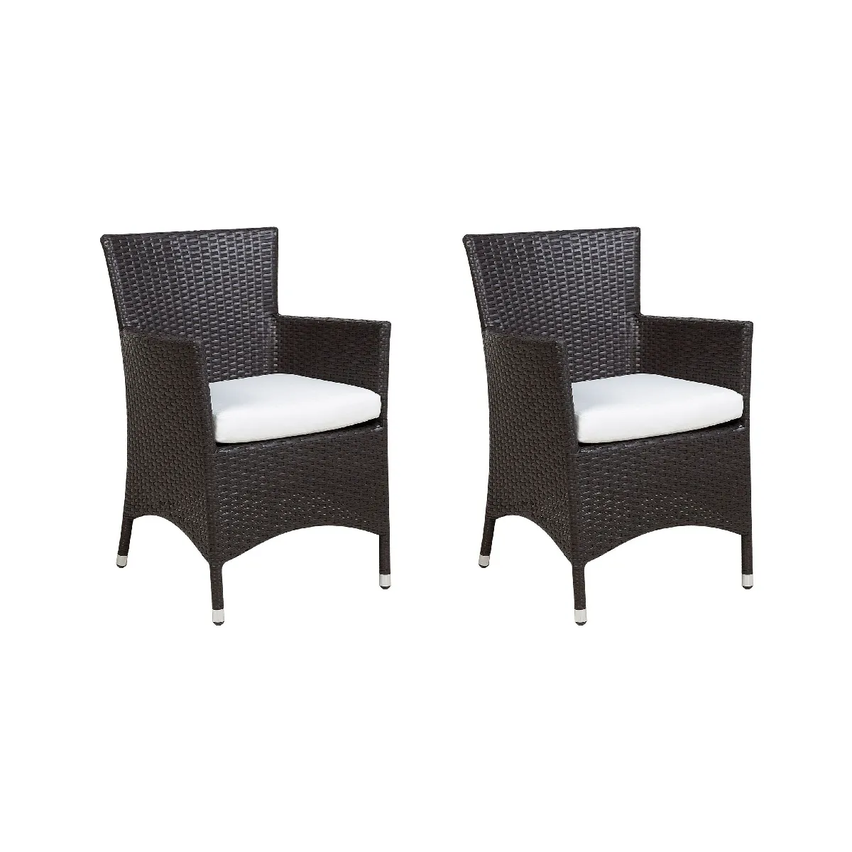 Fauteuils bas en polyrotin. Ces chaises de jardin grâce à leur construction solide et stable sont aussi confortables que des fauteuils. Avec leur dossier haut et leurs accoudoirs incurvés, elles offrent un confort d’assise maximal. Le coussin d'assise confortable et léger est doté d'un rembourrage épais et d'une housse amovible en polyester de grande qualité, anti taches. Le cadre robuste en aluminium enduit de poudre garantit une stabilité maximale. Détails: Type de produit: Chaise de jardin Style: Traditionnel Couleur principale: Marron Nuance: Marron foncé Type de matière: Polyrotin Matière principale: Polyrotin Matière secondaire: Polyester Matière du piétement: Rotin Matière de l`assise: Tissu Composition de la matière: 100% Polyester Accoudoirs: Oui Finition: Revêtu de poudre Pliable: Non Densité de la mousse du siège: 25 kg/m3 Empilable: Non Dimensions: Dimensions des accoudoirs: 66 cm Profondeur: 52 cm Épaisseur du siège: 11 cm Hauteur du siège: 41 cm Largeur: 52 cm Hauteur: 86 cm Surface d`assise: 45x44 cm Poids: 7 kg Charge admise: 140 kg Informations d`assemblage: Ne nécessite pas d'assemblage Texte sur la résistance: La résistance légère à l'eau vous permet d'utiliser librement l'article à l'extérieur et de le garder à l'extérieur pendant les pluies légères et dans des conditions humides. S'il n'est pas possible de le ranger à l'intérieur quand il n'est pas utilisé, nous recommandons de le couvrir d'une bâche. L'exposition à long terme du meuble à l'humidité peut l'endommager. Résistance: Humidité Conseils de maintenance: Polyrotin: 1.Nettoyez avec des détergents à base de savon. N'utilisez pas de nettoyants chimiques agressifs 2.Les ustensiles ou accessoires en verre peuvent surchauffer la surface 3.Pour prolonger la durée de vie de vos meubles, protéger-les contre toute exposition directe au soleil 4. Polyester: 1.Laver à la main uniquement, à l'eau froide et avec un nettoyant doux. Laver à l'endroit avec la fermeture éclair fermée 2.Ne pas sécher en machine et ne pas repasser 3.Lorsqu'il n'est pas utilisé, stockez-le dans un endroit propre et sec pour le protéger des conditions atmosphériques.