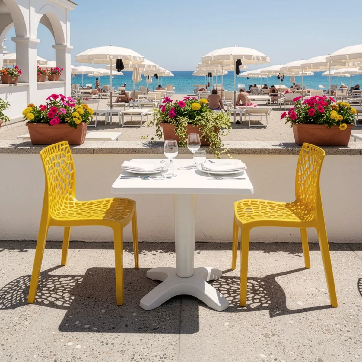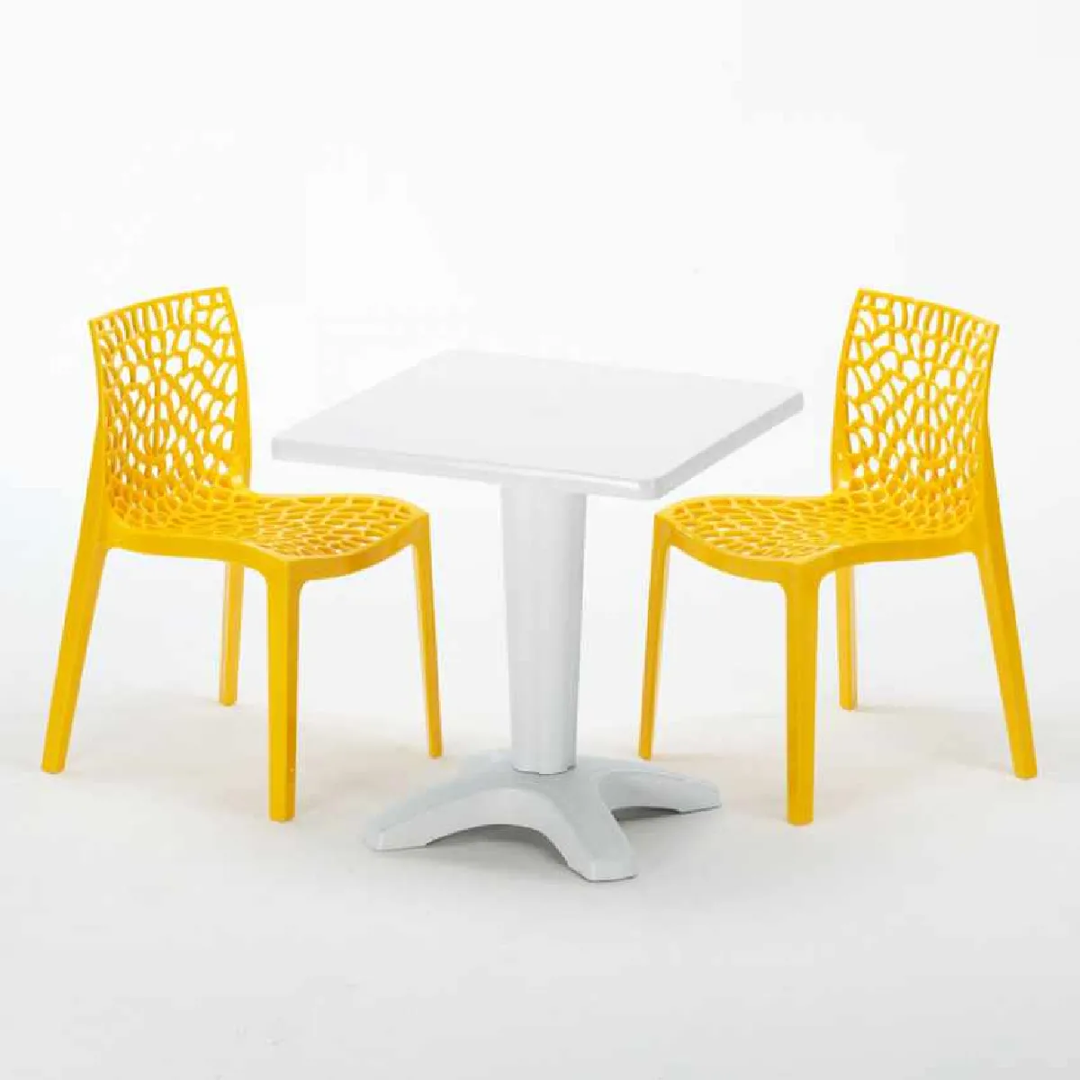Table et chaises pour bars, cafés et restaurants, version table carrée blanche 70x70cm et chaises Gruvyer de la gamme Grand Soleil.
