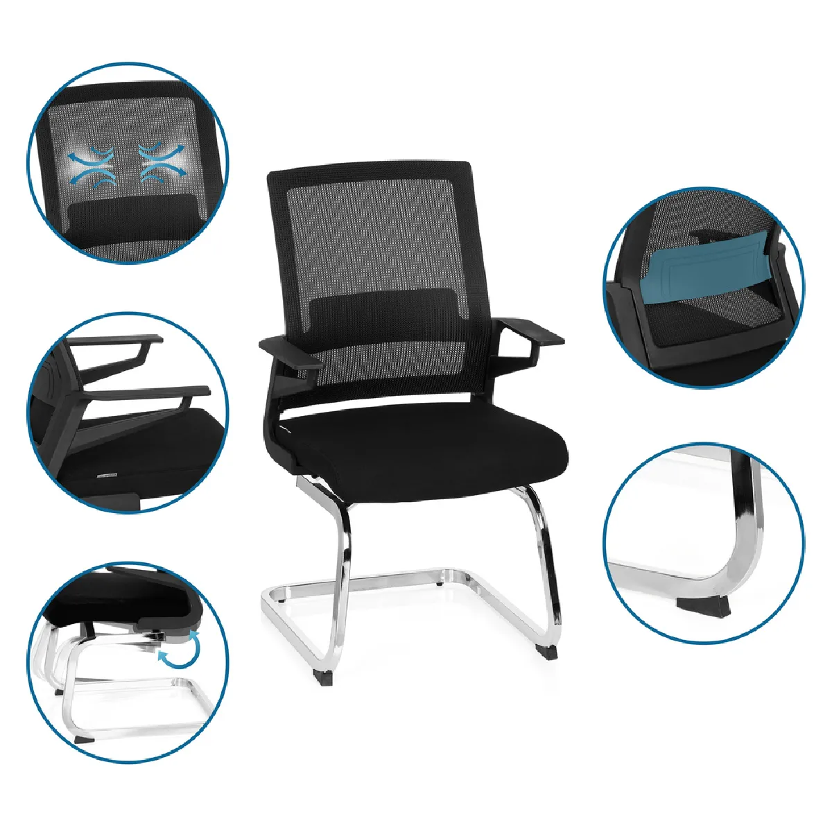 Cette chaise de réunion au design moderne et élégant s'adapte à tous les intérieurs et à tous les styles. Ce modèle est particulièrement robuste grâce à sa structure en acier chromé. Le dossier en tissu maille favorise une circulation d'air optimale et l'assise est revêtue d'un tissu rembourré. Le soutien lombaire maintient parfaitement le dos afin de favoriser une bonne posture d'assise.