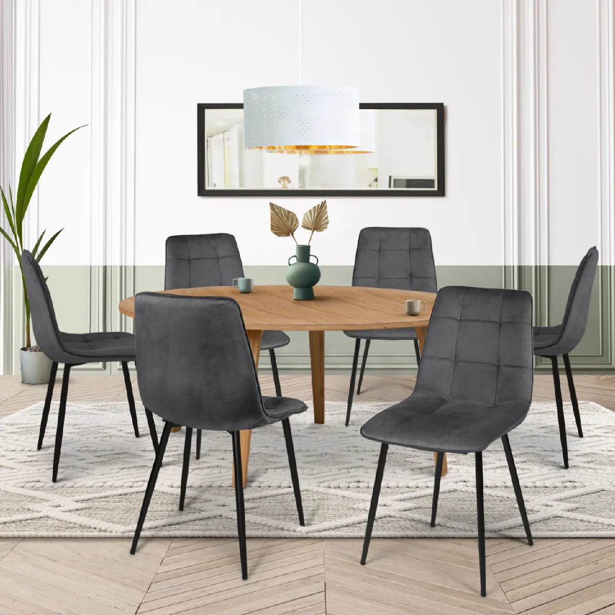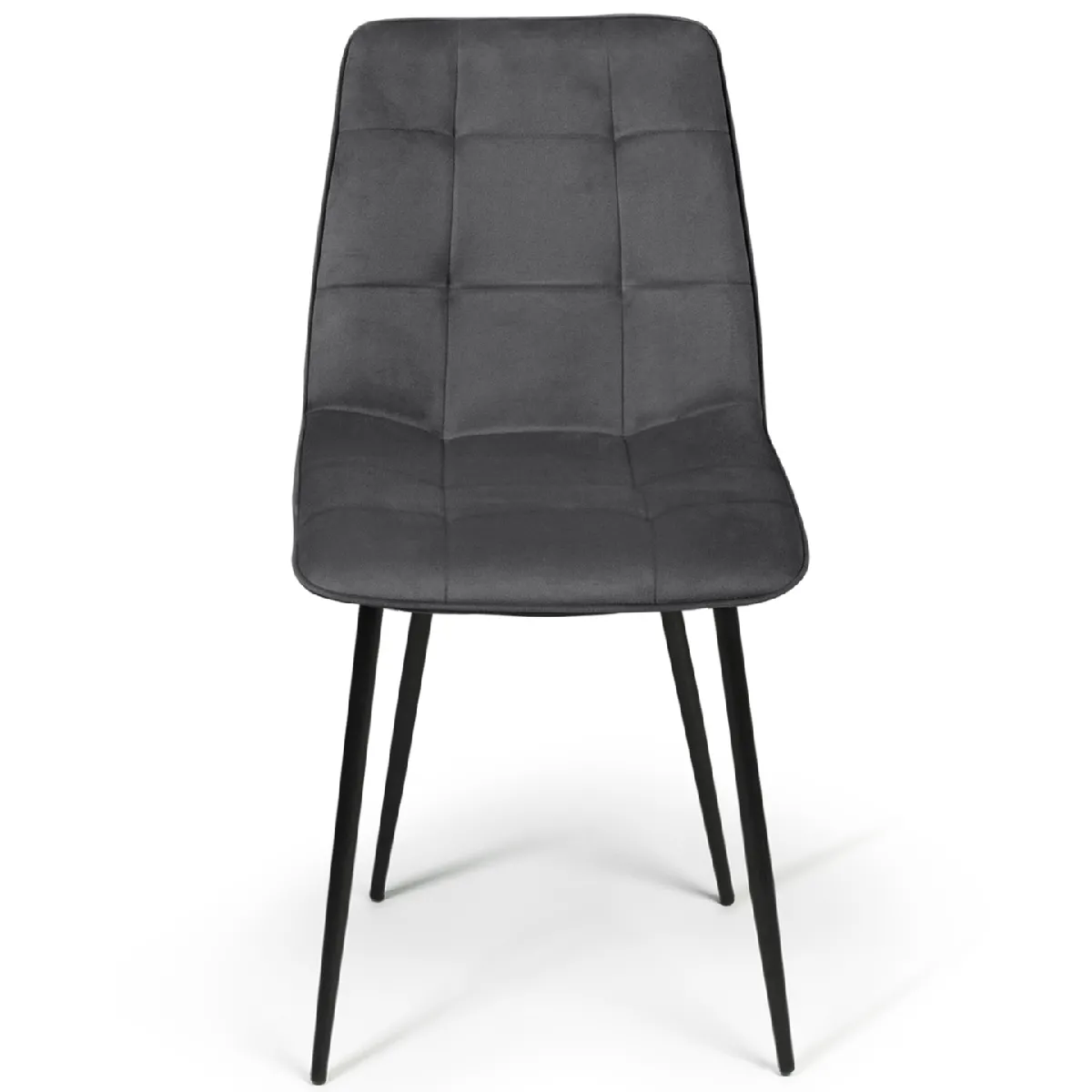 Vous recherchez des chaises modernes et élégantes pour meubler votre salle à manger ? Avec leur design contemporain aux lignes épurées, les chaises MILA en velours apporteront une ambiance cosy et chaleureuse à votre intérieur.Grâce à leur assise en velours matelassé, et leur dossier de 45 cm qui vous garantira un bon maintien du dos, vous serez installé confortablement et pourrez profiter sans crainte de longs repas de famille et de bons moments conviviaux entre amis.Le design chic des chaises MILA et leur coloris gris intemporel s'adaptent à tous les styles de décoration. Que votre intérieur soit plutôt urbain, contemporain ou rustique, ces chaises trouveront facilement leur place chez vous !Leurs 4 pieds en métal noir mat leur assurent robustesse et stabilité, tout en soulignant le look résolument moderne et design de ces chaises de salle à manger.Il ne vous reste plus qu'à vous installer confortablement autour de la table !Dimensions des chaises MILA en velours gris foncéDimensions globales : Longueur 46 cm x largeur 55 cm x Hauteur 88 cmDimensions de l'assise : L. 46 x l. 41 x H. 45 cmPieds en métal noir matRevêtement en veloursVendues en lot de 6 chaisesÀ monter soi-mêmeCes chaises MILA sont également disponibles dans différents coloris : - Lot de 6 chaises MILA en velours gris foncé- Lot de 6 chaises MILA en velours bleu- Lot de 6 chaises MILA en velours gris clair- Lot de 6 chaises MILA en velours mix color bleu x2, gris foncé x2, gris clair, jaune- Lot de 6 chaises MILA en velours mix color bleu x2, gris foncé x2, gris clair x2- Lot de 6 chaises MILA en velours mix color pastel bleu x2, gris foncé x2, gris clair, rose- Lot de 6 chaises MILA en velours mix color vert x2, gris foncé x2, gris clair, jauneRetrouvez l'ensemble de nos chaises en velours sur notre boutique en ligne !